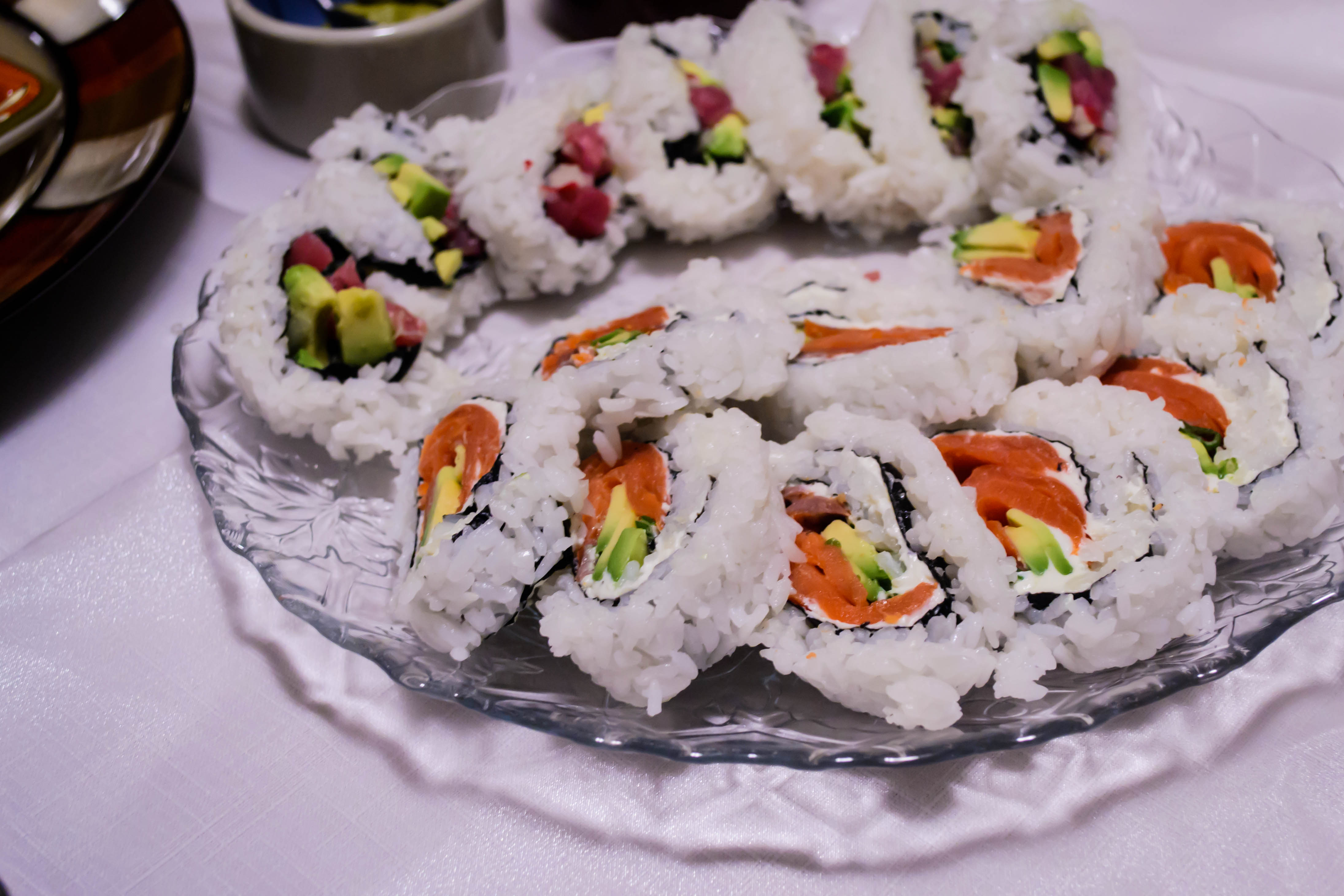 One contained ahi, avocado, and radish. The other enclosed smoked salmon, avocado, and a wasabi-spiked cream cheese.