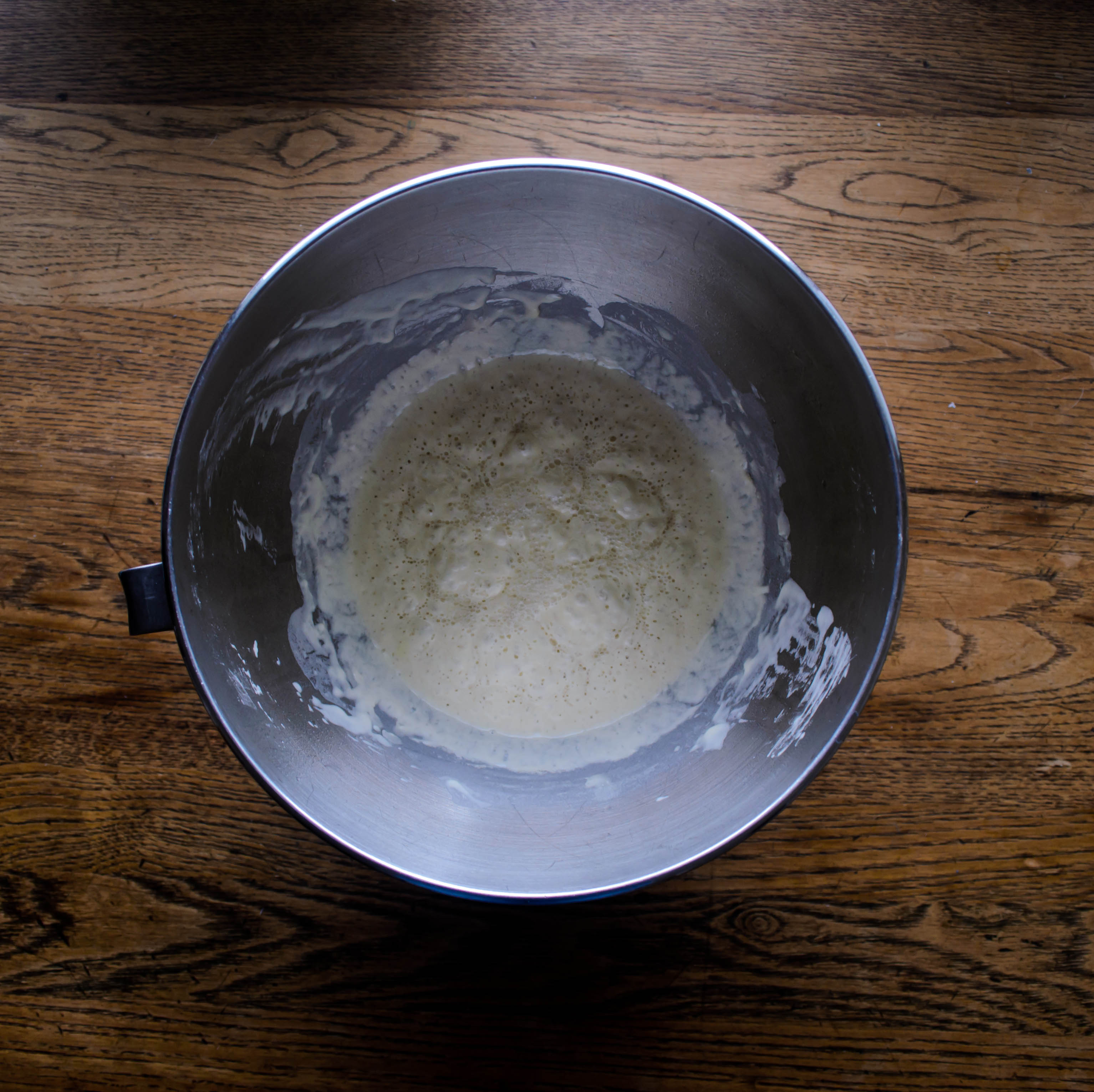 - To make the biga, combine the ½ teaspoon of yeast and the 4 ounces of water in the bowl of your stand mixer. Stir and let sit to dissolve for 5-10 minutes. Add the flour (I highly recommend using weight measurements, as does the kitchn recipe) and stir by hand or with the paddle attachment for 1-2 minutes to start the gluten chains working. It will form a thick gluey goo. Cover with plastic wrap and let it sit at room temperature overnight.