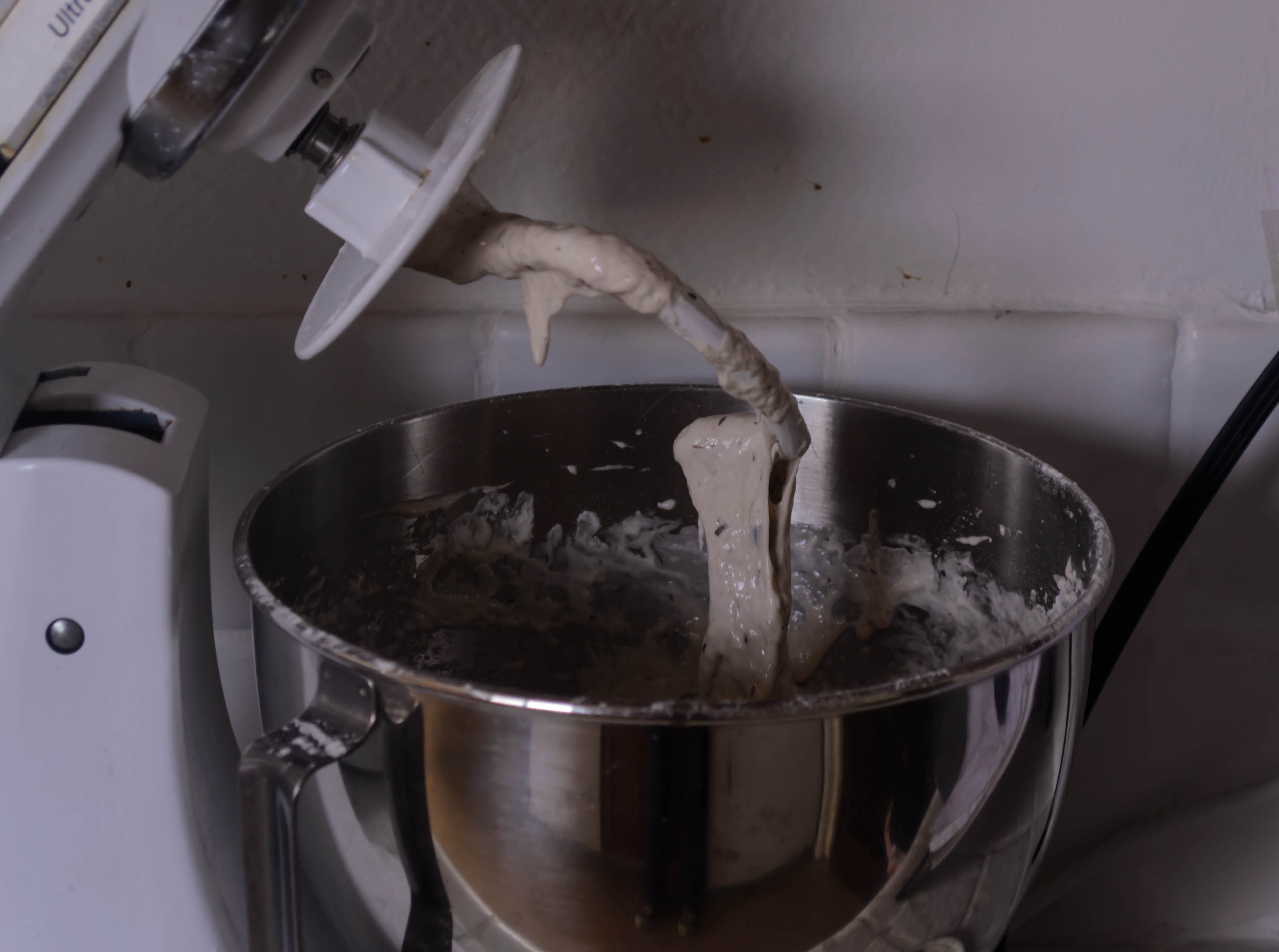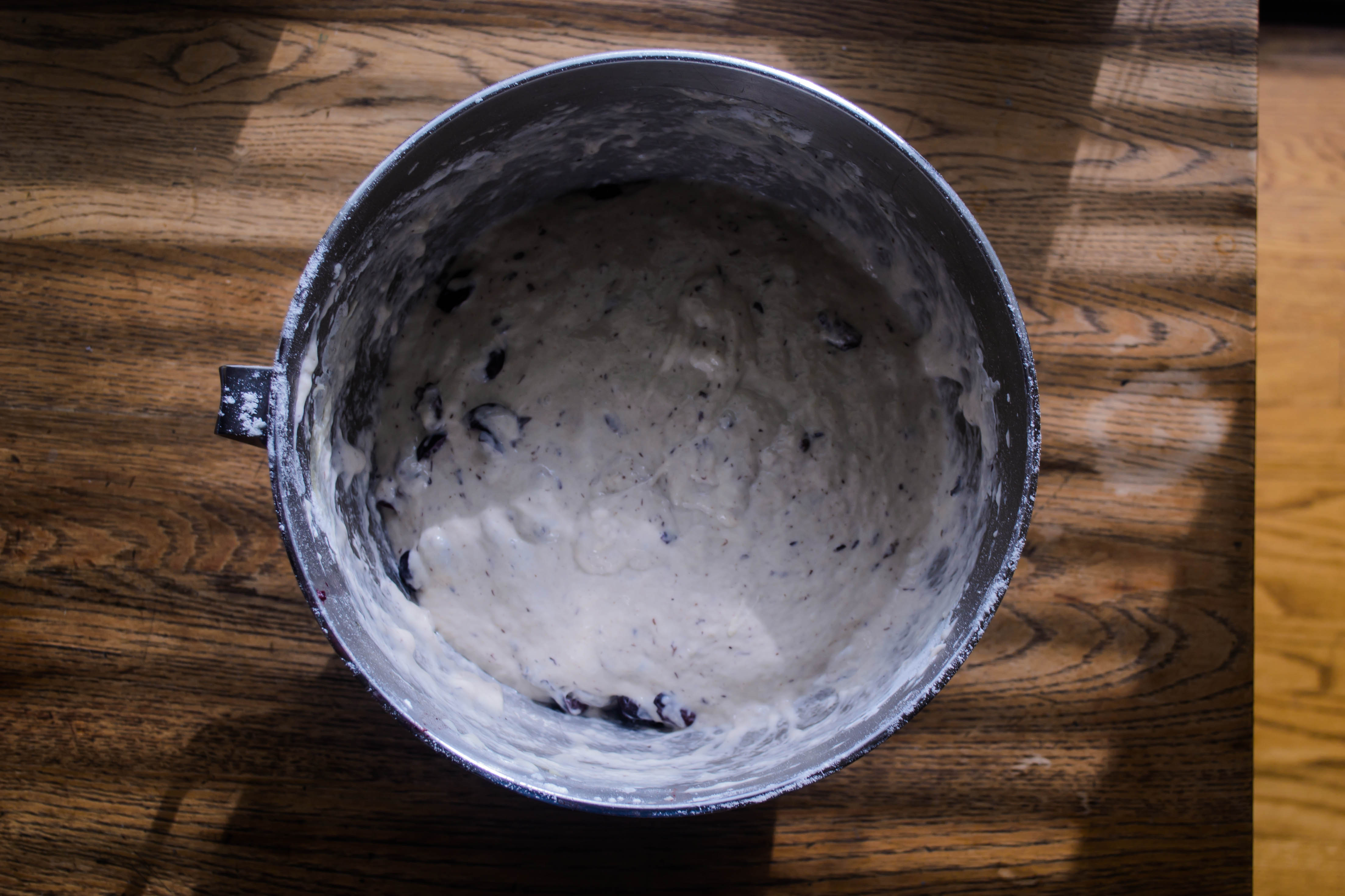 - After 10-20 minutes, add the chopped olives to the dough/batter and knead on medium speed with the dough hook attachment for 15-18 minutes. On my stand mixer (brand KitchenAid), this was level 6. As the kitchn notes, keep an eye on your mixer, as it tends to walk its way across the counter at this speed.