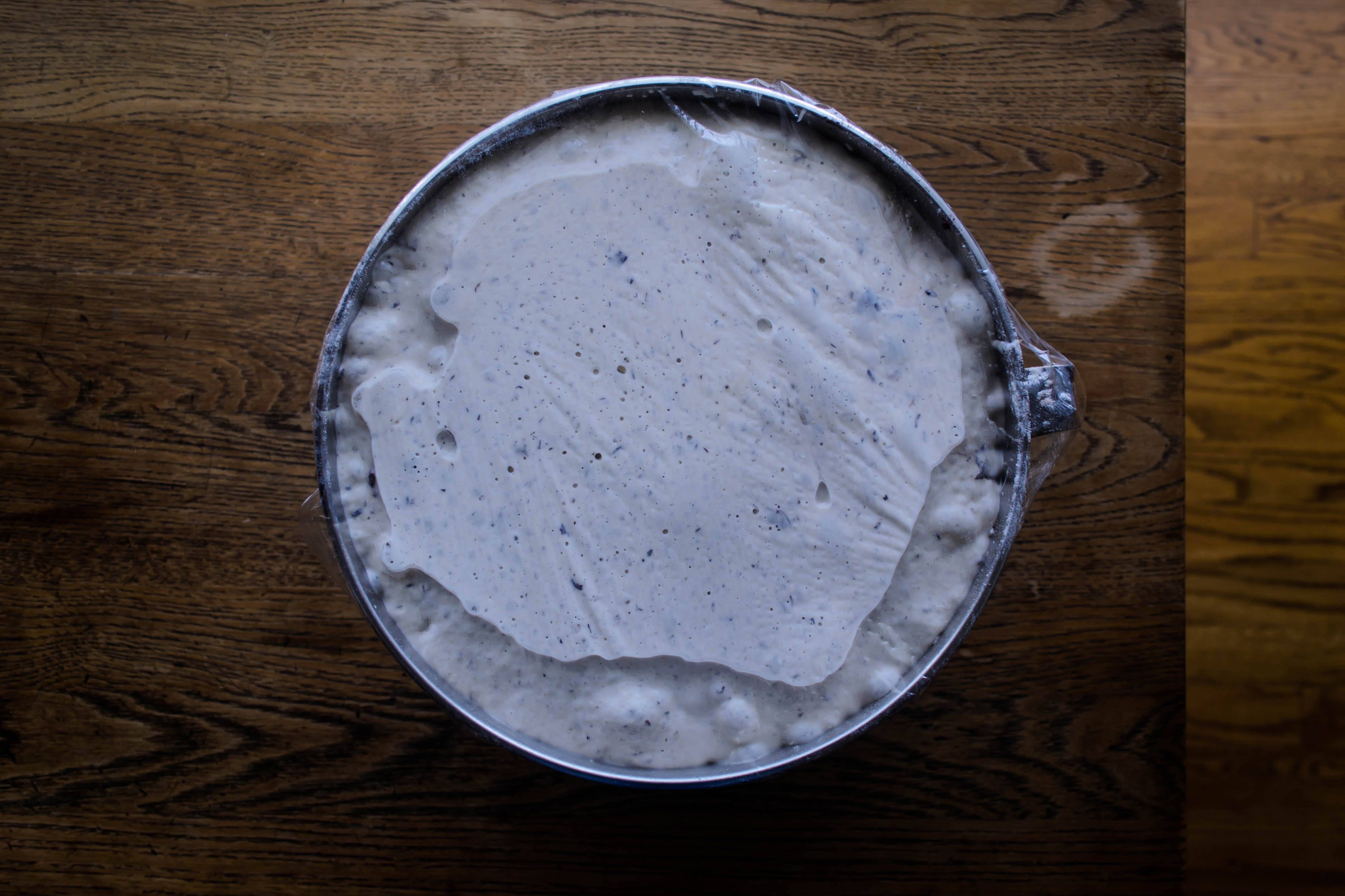 - After 15-18 minutes, the dough will still turn into a loose puddle when you turn off the machine, but it should be smooth and shiny with bits of olives scattered through it. Cover it with a layer of plastic wrap and set it in a slightly warm place (70-75F) for 2-3 hours, until it triples in size.