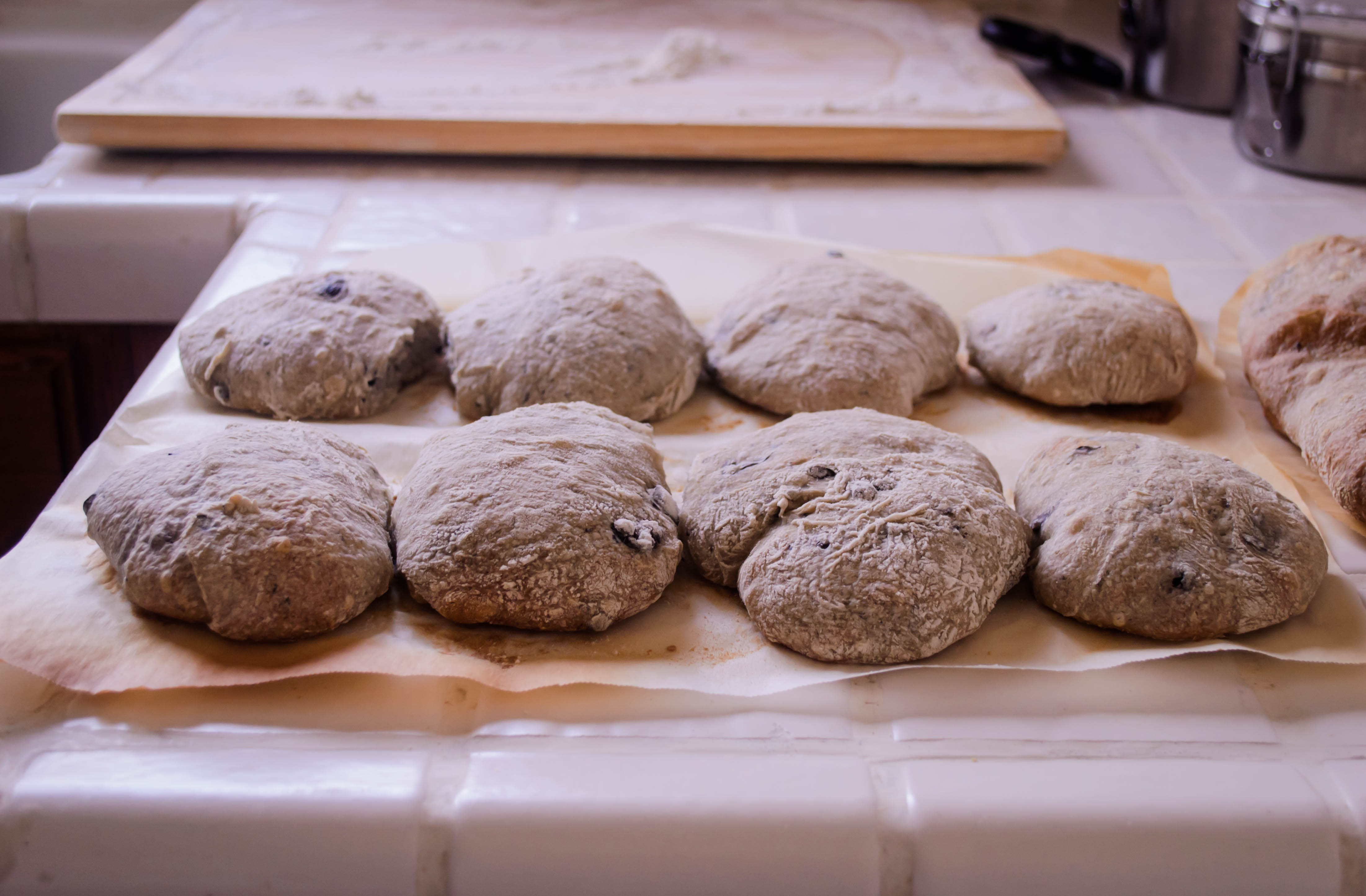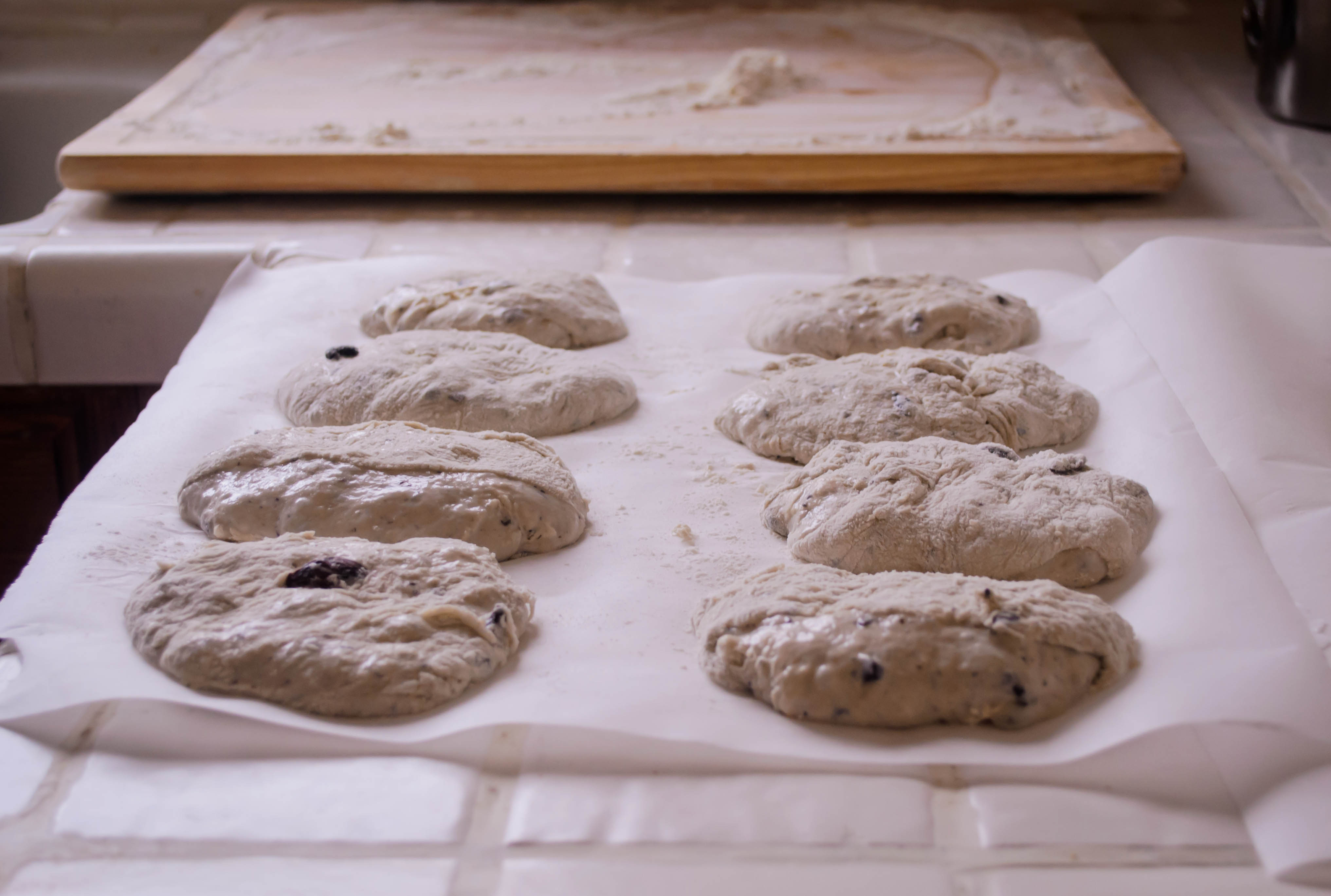 Fortunately, I’ve been making sourdough lately with a fairly wet dough, so the look of the olive-speckled, bubbly mass after three hours of expansion didn’t unnerve me too much. When it came time to shape the loaves (I opted for eight sandwich-sized rolls and one large loaf), I picked up the first one and just laughed. “Shaping” is a word you can use, but without a banneton or brotform of some sort, the dough just sort of sighs into the form it wants to be and stays there, a slightly contained puddle oozing its way threateningly toward the edges of the parchment paper you’ve so carefully flopped it onto. When I handled the rolls, in texture they reminded me bizarrely of – don’t laugh – a fresh oyster or an egg yolk sitting in my hand.