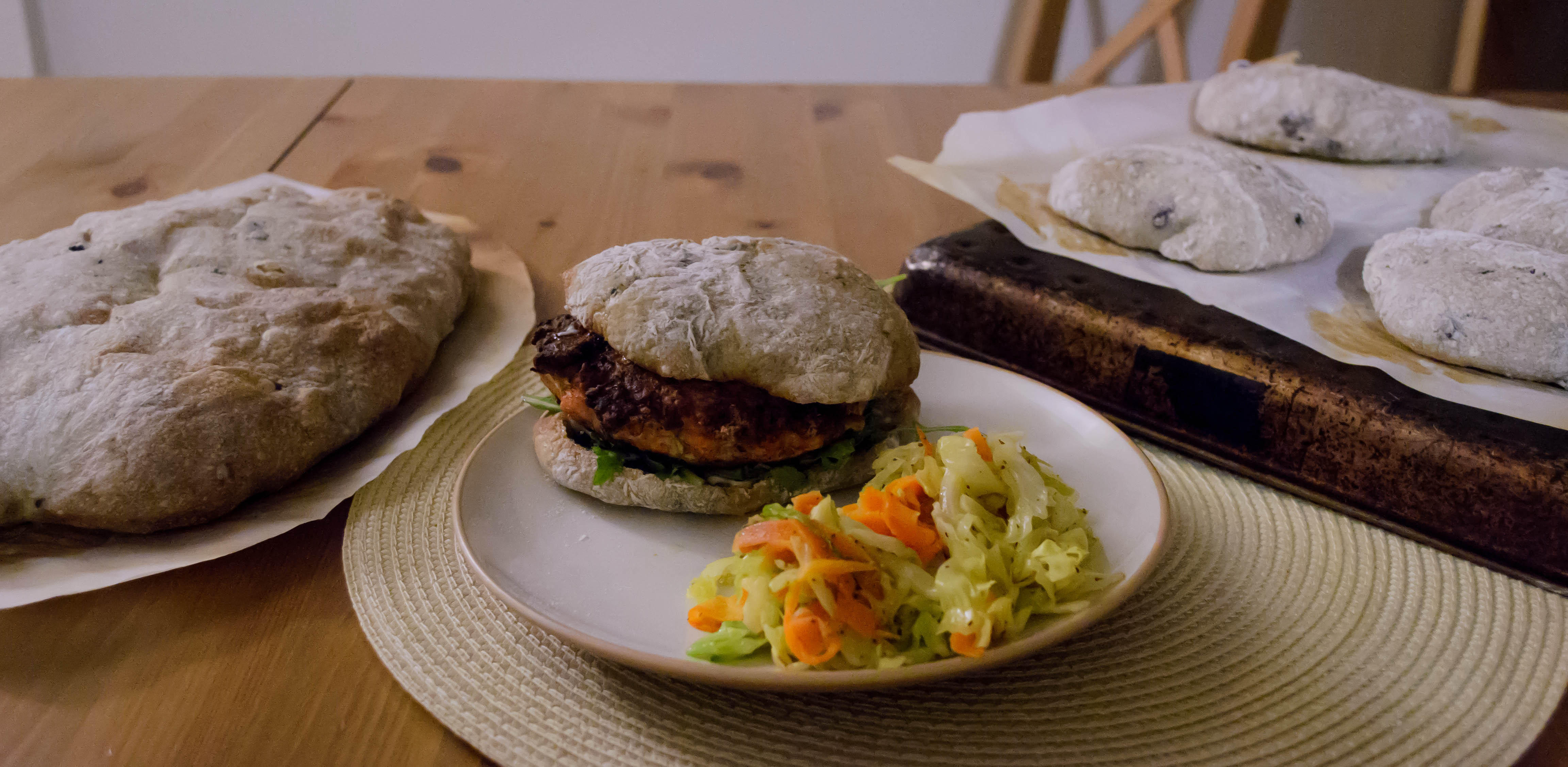When I considered how to serve these, after I got past the urge to just tear into them and eat four or five (I stopped at one), I decided to go back to the first, unsuccessful attempt. In our previous, not-ciabatta meal, I’d used the rolls as vehicles for salmon burgers inspired by an old favorite restaurant in Eugene. Salmon burgers, then, it would have to be: a mixture of fresh and smoked salmon kneaded with egg and flour to help hold them together, parsley, a bit of garlic, and some salt and pepper. The olives in the bread were a nice addition, lending some light brininess to the burger appropriate to its marine origins.