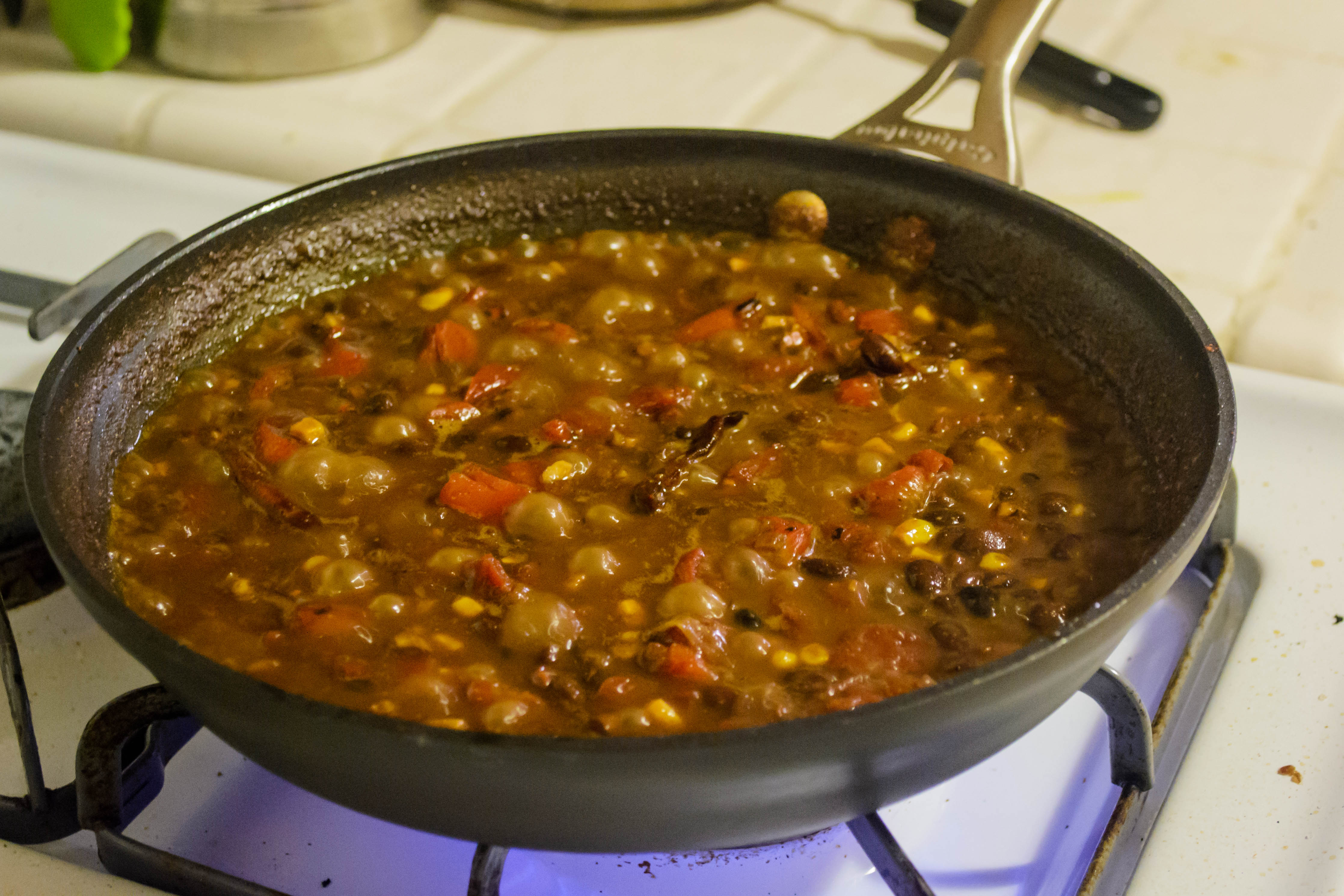 - Now pour in the beans, canning liquid and all, along with the tomatoes and the beer. Turn the heat up to medium high, stir to ensure nothing is sticking to the bottom of the pan, and let it bubble away, stirring occasionally, until much of the liquid is absorbed. For me, they reached the consistency I wanted in 20 minutes – not totally dry, but not tremendously soupy either.