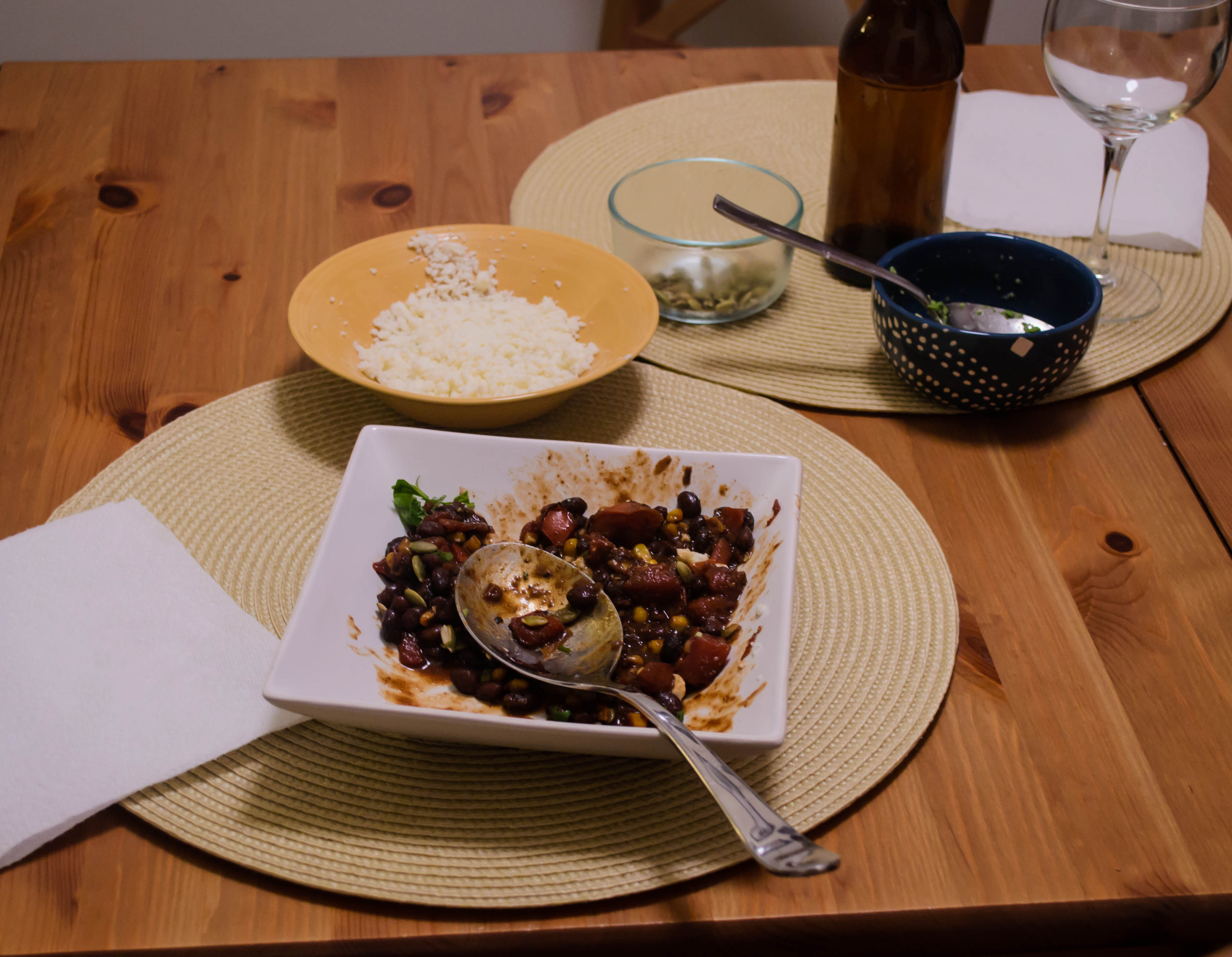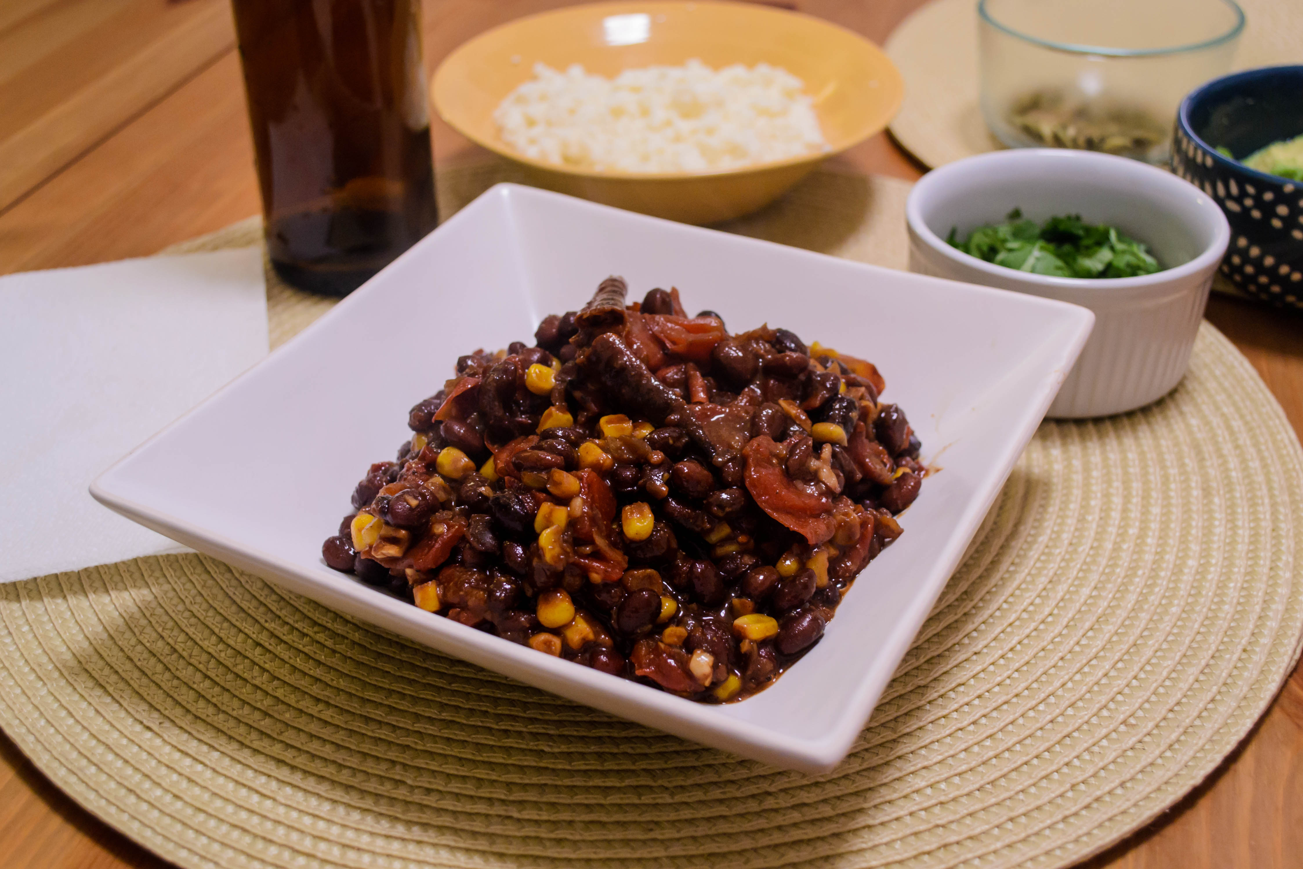 Beer, I found, enhances this earthiness perfectly, especially a dark beer like a porter or a stout. The bitterness of an ale or even a lager is tempered in a darker brew, giving way to toasted, bready flavors that mingle well with the earthy pleasantness of beans. Since this discovery, we’ve charged through a number of bean-and-beer concoctions, including a chile that also contained hunks of slow cooked bison stew meat and a barrage of spices – a triumph. But the one I want to come back to for you is the original, simple combination. Beer and beans. A few flavor enhancers by way of garlic, onion, some almost-burned corn kernels, and a scoop of fire-roasted tomatoes, and you’re looking at a side dish that I’d push away the mains for.