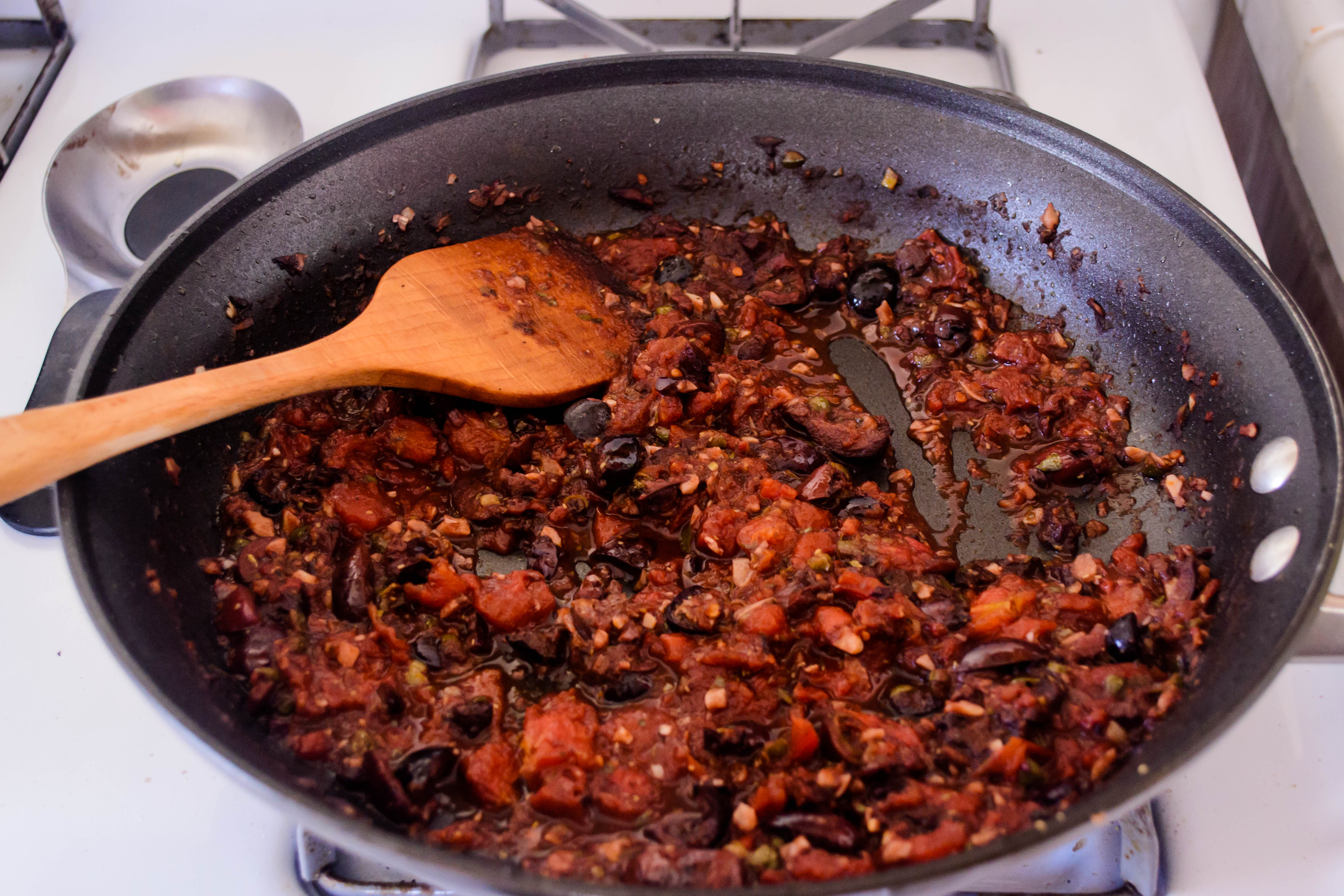 - When the mushrooms are done, set them aside in a small bowl and discard the thyme sprig, then put the skillet back over medium heat. Add the remaining 2 tablespoons of olive oil and the minced garlic. Saute for 1-2 minutes, until the garlic is soft and aromatic and edging toward golden. Add the anchovy fillets and mash them around with a wooden spoon to break down. Scrape in the capers and olives and saute for an additional 1 minute.