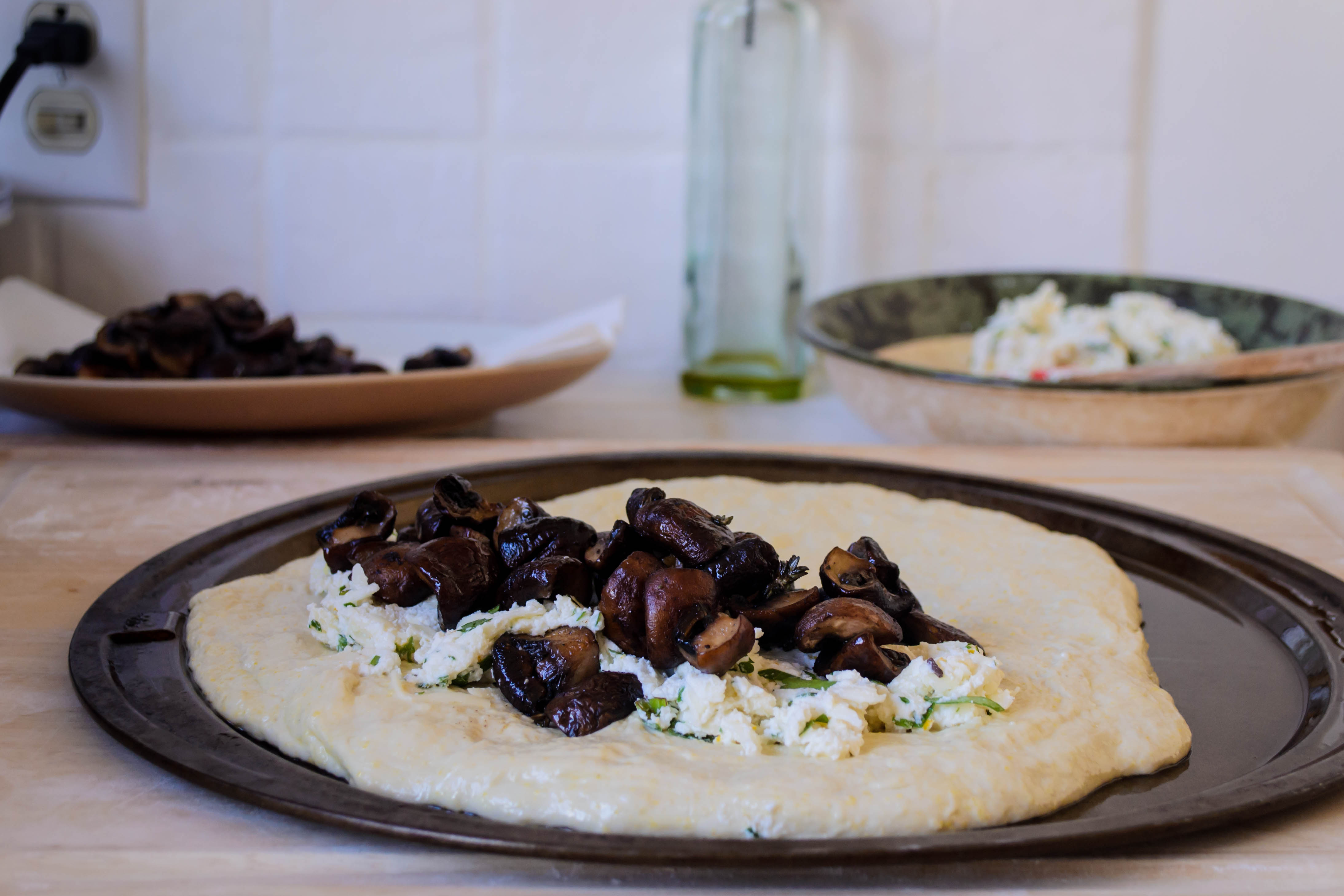 - To assemble, spread the cheese mixture over half of the stretched dough, leaving a healthy inch margin around the edge. Pile the mushrooms on top of the cheese, and then use a slotted spoon to add the chunky portions of the sauce – the tomato and olive and caper bits – on top of the mushrooms (again, keep and respect that inch margin).