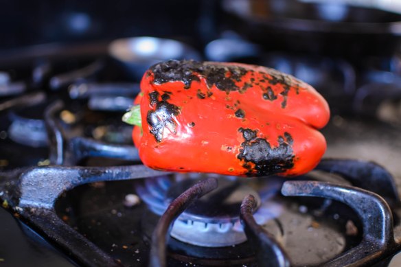 - If you are using jarred roasted red peppers, skip this step. If you are using a fresh red bell pepper, while the oven is warming, char the red bell pepper over a gas burner turned on high. Let the skin blacken, adjusting the placement of the pepper with a pair of metal tongs to allow for maximum char. As each lobe blackens, turn to a new side, repeating until the skin is well charred and the flesh of the pepper is starting to soften, around 15 minutes. Transfer to a bowl and cover tightly with plastic wrap for another 15 minutes.