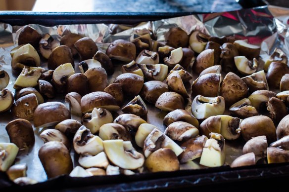 - While the sauce is simmering, you can attend to the mushrooms: preheat the oven to 400F and toss the quartered mushroom caps with the remaining 3 tablespoons olive oil. Roast 20-25 minutes, stirring once at around the halfway mark. When finished, remove from the oven and turn the oven temperature down to 375F.