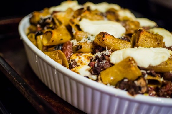 How I’ve missed out! The beauty of baked pasta, if you remain uninitiated, is the contrast of textures – creamy and tender below, but bronzed and crisp on top, not to mention the opportunity to consume wicked quantities of bread crumbs and/or cheese. The edges of the pasta pieces that protrude above whatever final layer you’ve assigned the dish – cheese or crumb or sauce – toast and sizzle and become pleasingly dark and crunchy; they are the part everyone you feed will fight over.