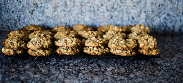 But anyway, egregious quantities of barely soft butter (thought it does make a lot of cookies, so don’t despair), heaps of rolled oats, and a generous dosing of both white chocolate chips and meaty, moist dried apricots get mounded into tablespoon-sized heaps and baked until they are barely cooked through – they come out still quite soft and a little raw looking in the middle – and set up as they cool. The butter should be malleable but still cool from the fridge, never melted, and the dough should be stowed back in the fridge to keep the butter cool in between baking each batch; as with pie crust or biscuits, this keeps the cookies from flattening out as they cook. In high school I used margarine instead; if you do this they will stay puffy, but I prefer the flavor and make-up of butter. The oats should be of the old fashioned rolled variety, not quick cooking, for texture in the final cookie.