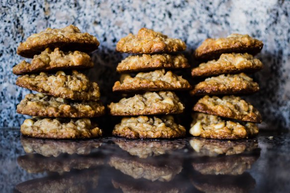 • If you are using an electric mixer, switch now to a sturdy spatula or wooden spoon and prepare to work out your upper arms. If you are in a stand mixer, continue at low speed. Stir in the oats until well incorporated, then the fruit and white chocolate chips just until mixed in.