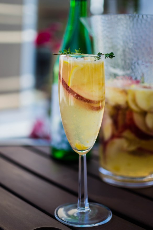 * a note for serving: I used a champagne glass here for presentation purposes and loved the look of it, but once loaded with fruit, it held an unsatisfying quantity of actual drink. I’d suggest a wine glass or even a tumbler. Additionally, while the slices of peach looked very pretty, smaller chunks are a little easier to navigate both while pouring and in the glass itself.
