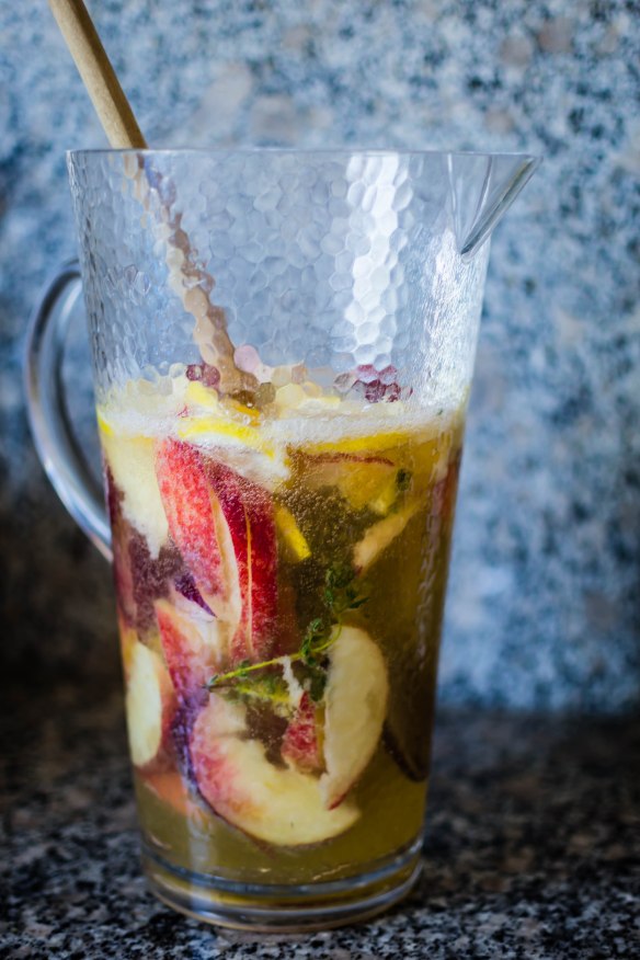 - While this mixture is simmering, put the peaches and lemons into a large pitcher or punch bowl, then add the hot wine and preserves mixture, including the herb sprigs. Add the remaining wine and the liqueur, if using.