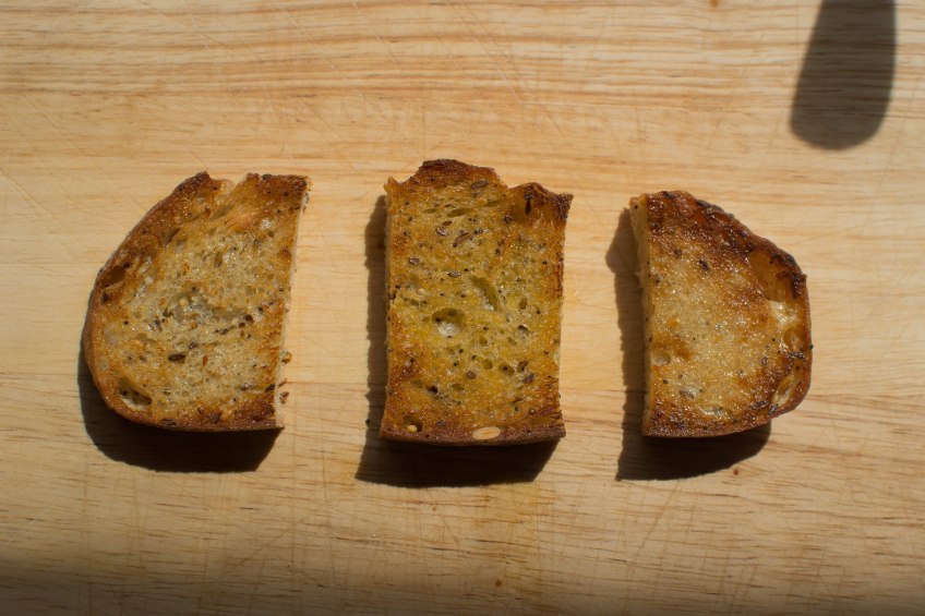 Triple Play Deviled Eggs Crostini