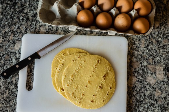 But this frico is made with softer cheese: I tried both cheddar and pepperjack, and found I preferred the latter. When you first turn it into the pan, a distressing quantity of grease appears and the cheese bubbles worryingly around the outer edges of the tortilla, and you are sure this isn’t going to work at all. Give it a minute or two, though, and then cautiously but firmly apply your spatula, and the tortilla should have a crunchy, orange, lacquered coating. You then have only to set the egg on top, pile with accouterments, and gobble up the whole thing.