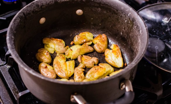 - Dry out the pot you used to boil the potatoes and heat 2 tablespoons of oil over medium high heat until shimmering. Add potatoes in a single layer (this will require multiple batches). Salt very lightly and cook over medium high heat until they are toasty brown, about 4 minutes. Flip and repeat. Remove from the pot and repeat the browning process with the remaining potatoes, adding more oil as needed.
