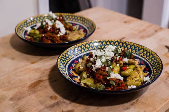 - To serve, pile up some of the potatoes in a shallow bowl. Ladle on a generous helping of the sofrito, then crumble over a few ounces of goat cheese and a good sprinkle of chopped cilantro.