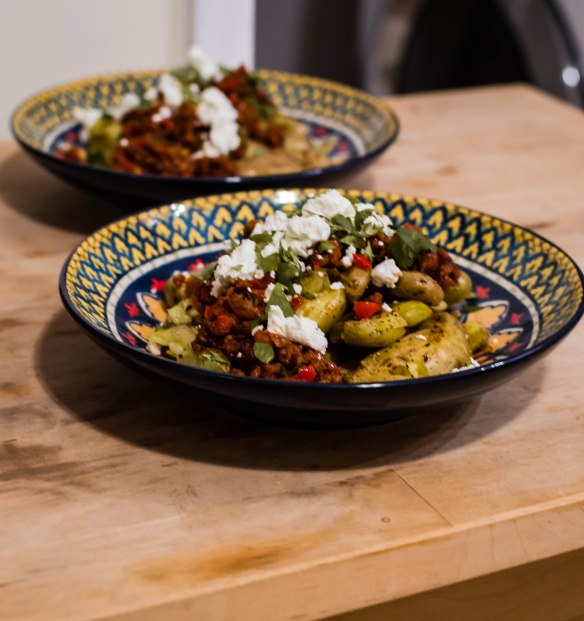 The dish I’m recreating here was served to me years ago as an appetizer at Father’s Office, a Westside gastropub staple and home not only of the divisive Office Burger, but of the delightfully draconian “no substitutions, no ketchup” policy (which I for one appreciate, though understand others’ objections to). Instead of the controversial burger, N. and I ordered a few small plates to share and couldn’t get over these potatoes, which arrived in a golden heap, their skins wrinkled in a way that can only be achieved by deep frying, smothered in a rich, spicy sofrito that, forgive me, was not exactly like a thick chili, but is the best way I can describe the sauce if you’ve never had it. On top of that, a generous crumble of goat cheese and some cilantro sprigs, and the same night I was looking up the history and variations of the component parts so I could recreate it.