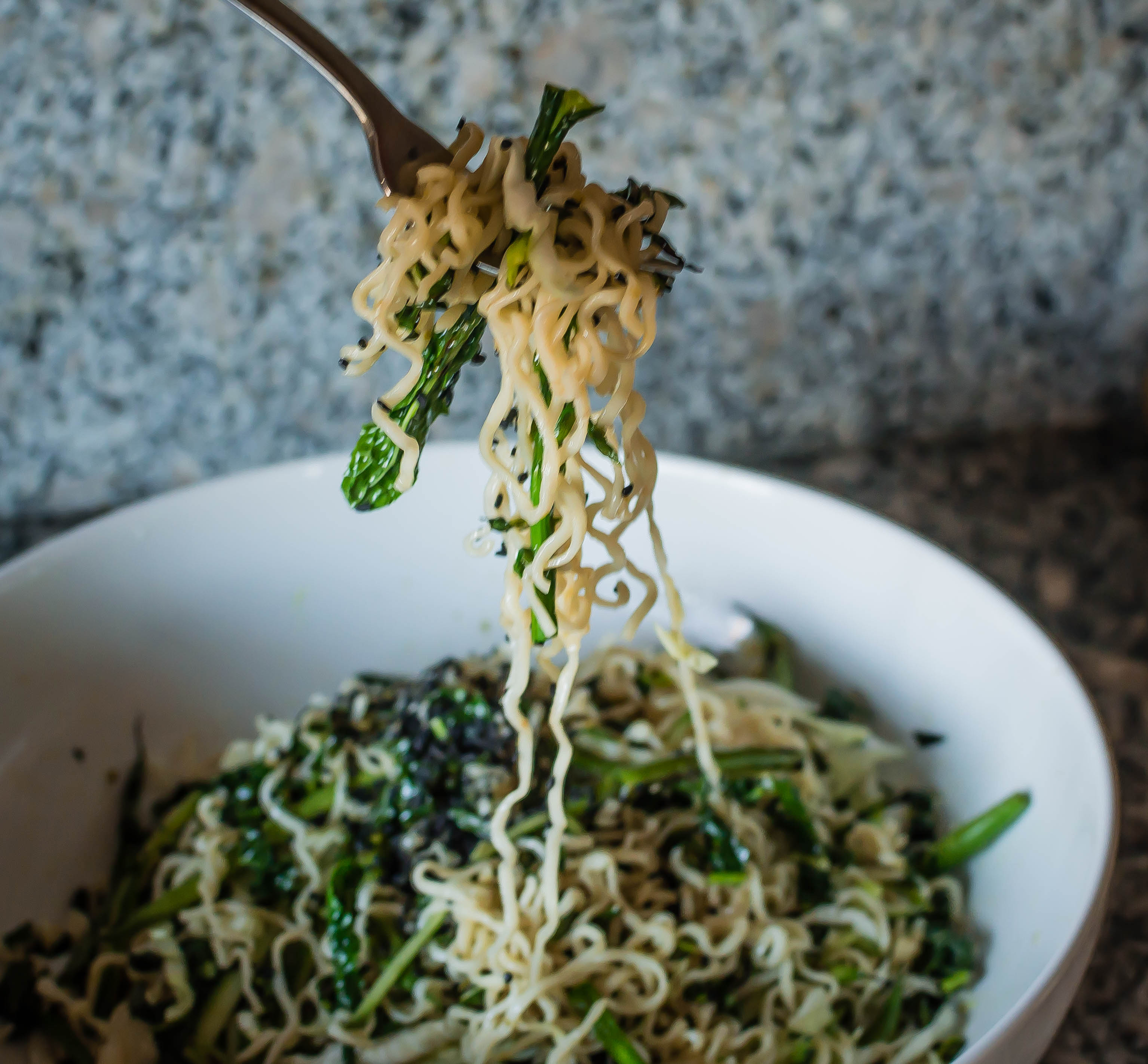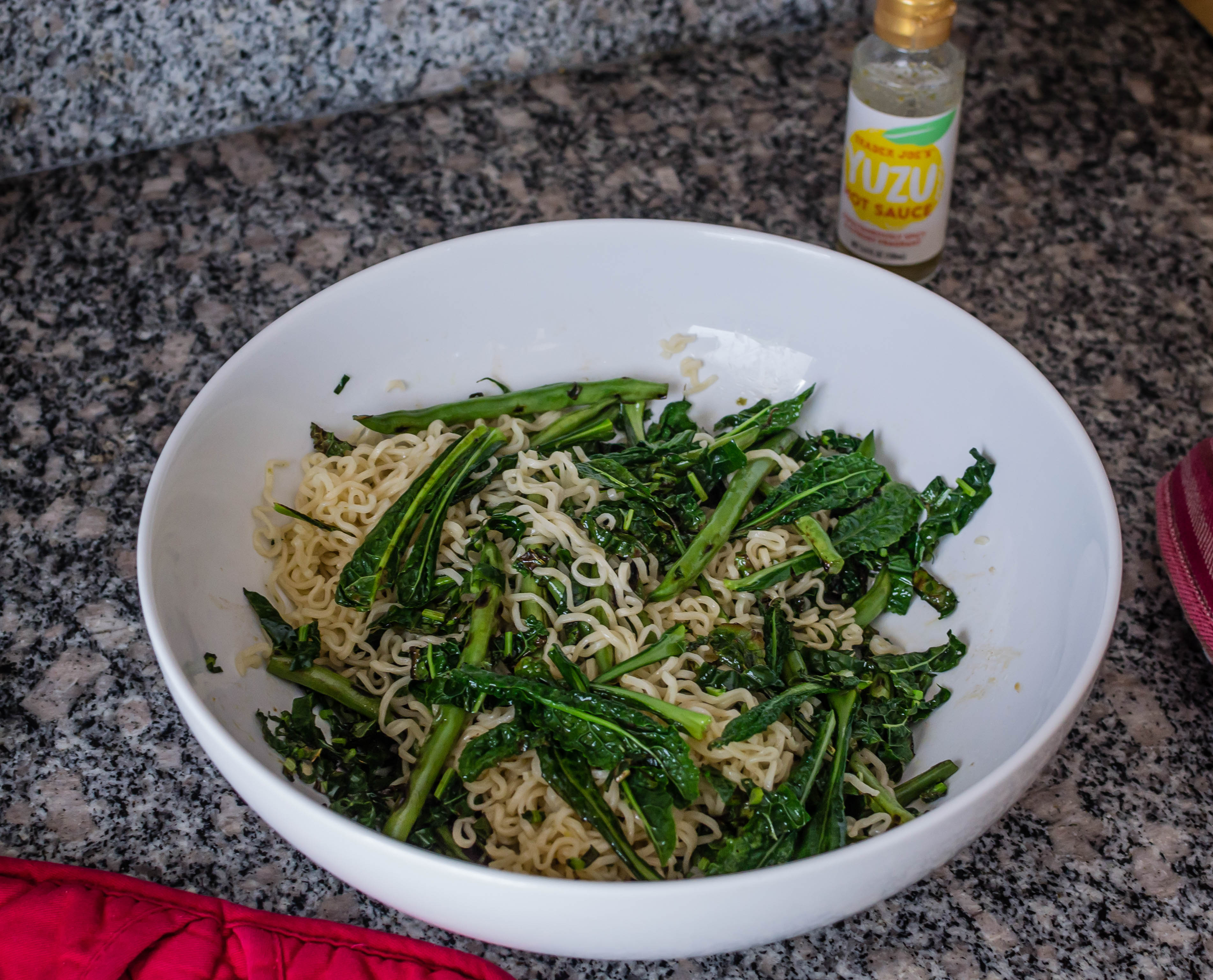 - Return the pan to the heat, add another 1 teaspoon of oil (plus 1 teaspoon of sesame oil if desired) if it looks dry, and add the kale. Again cook, stirring occasionally, until the kale has softened and many of the leaves have brown, toasted spots. This took me about 2 minutes. Add the charred kale to the bowl of noodles and green beans.