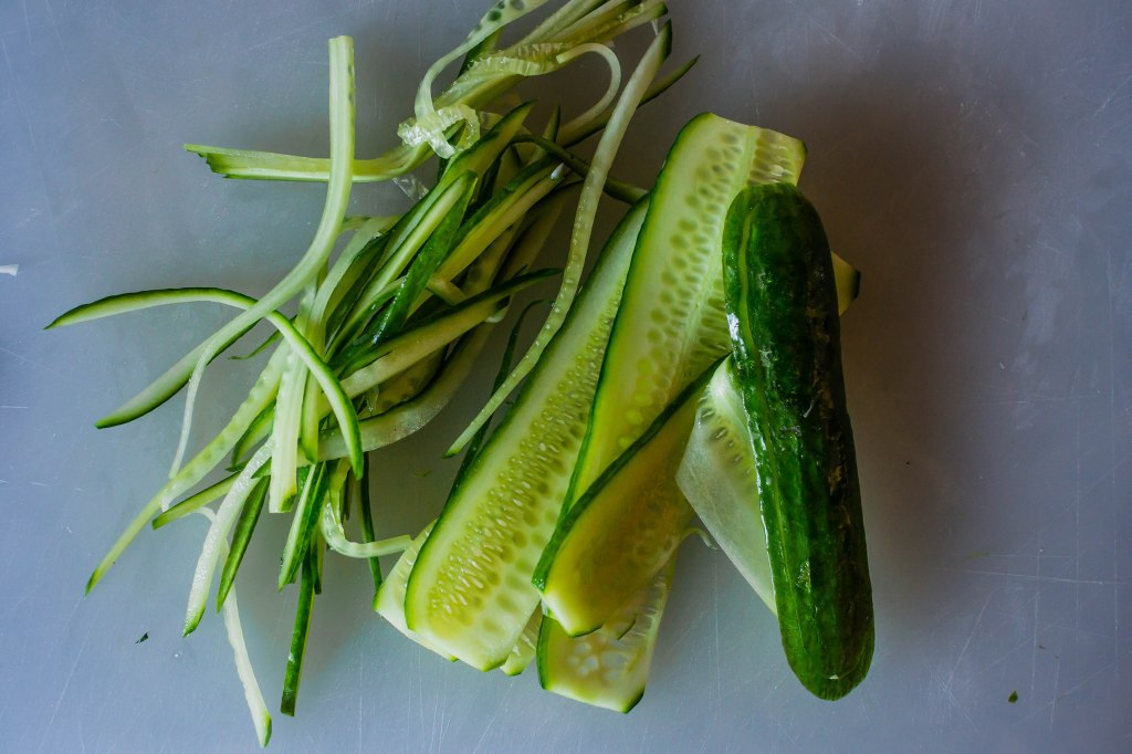 1 large Persian cucumber or 1 small conventional cucumber with large seeds removed, cut into thin planks and then julienned into long ribbons, as in the photo above