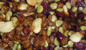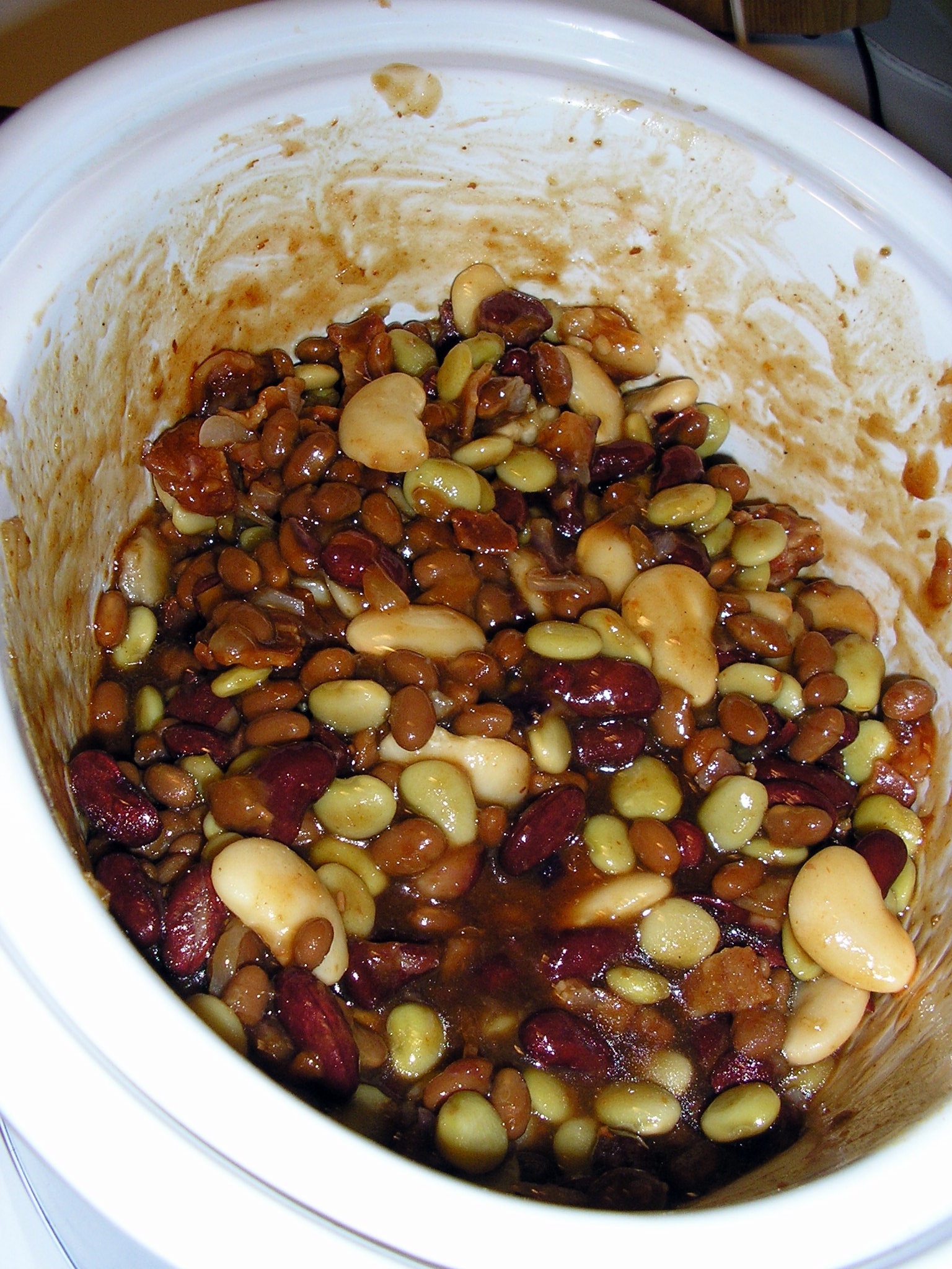 Drain and rinse lima, butter, and kidney beans only (baked bean liquid is necessary for the sauce). Mix all ingredients together. Either cook in a slow cooker for about 6 hours (add a ladle of water if they seem dry), or bake in the oven in a 2 qt casserole at 350o for 1 hour.