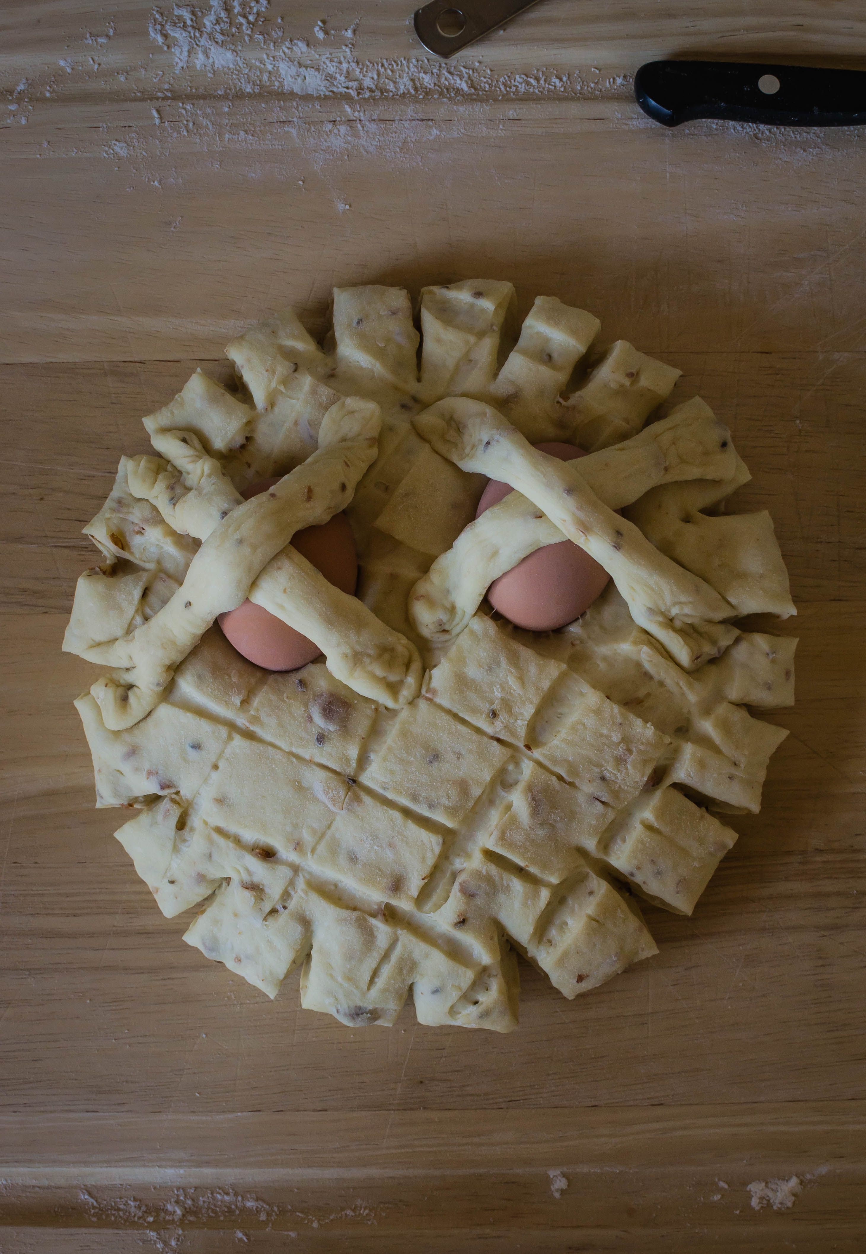 • Let the dough rise, covered with plastic wrap or a clean towel, until doubled: 1 – 1½ hours. Meanwhile, hard boil the eggs: bring a small pot of water to a rolling boil, then use a spoon to gently add the eggs. For large eggs, boil 10 minutes and then remove eggs and set aside to cool. For medium eggs, boil 8 minutes and then remove and set aside to cool. Remember: the eggs will bake along with the bread.