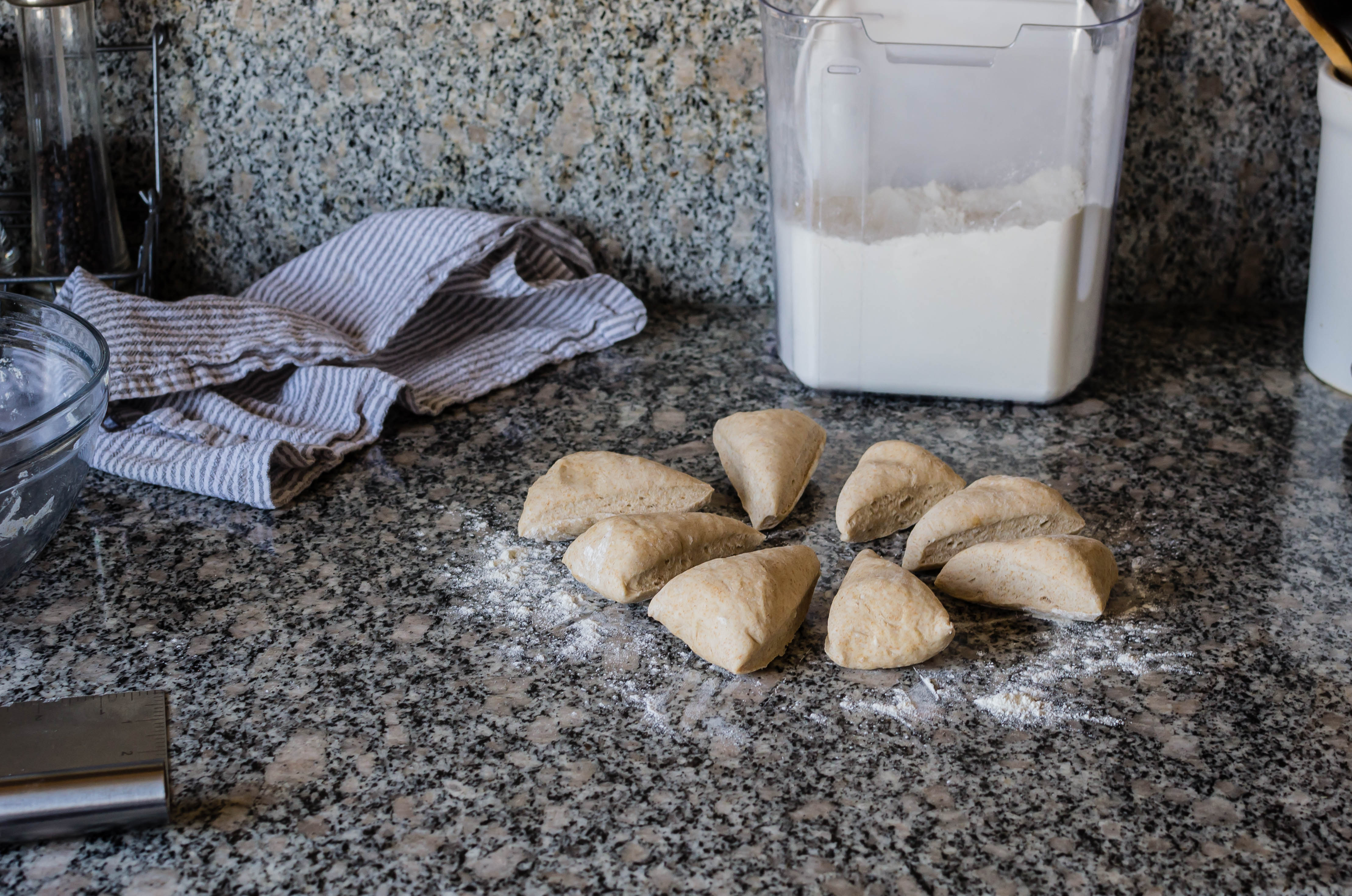 • After the dough has rested, turn it out onto a lightly floured surface and divide into 8 equal portions. Working one at a time, roll the portion into a thin circle 7-8 inches in diameter.