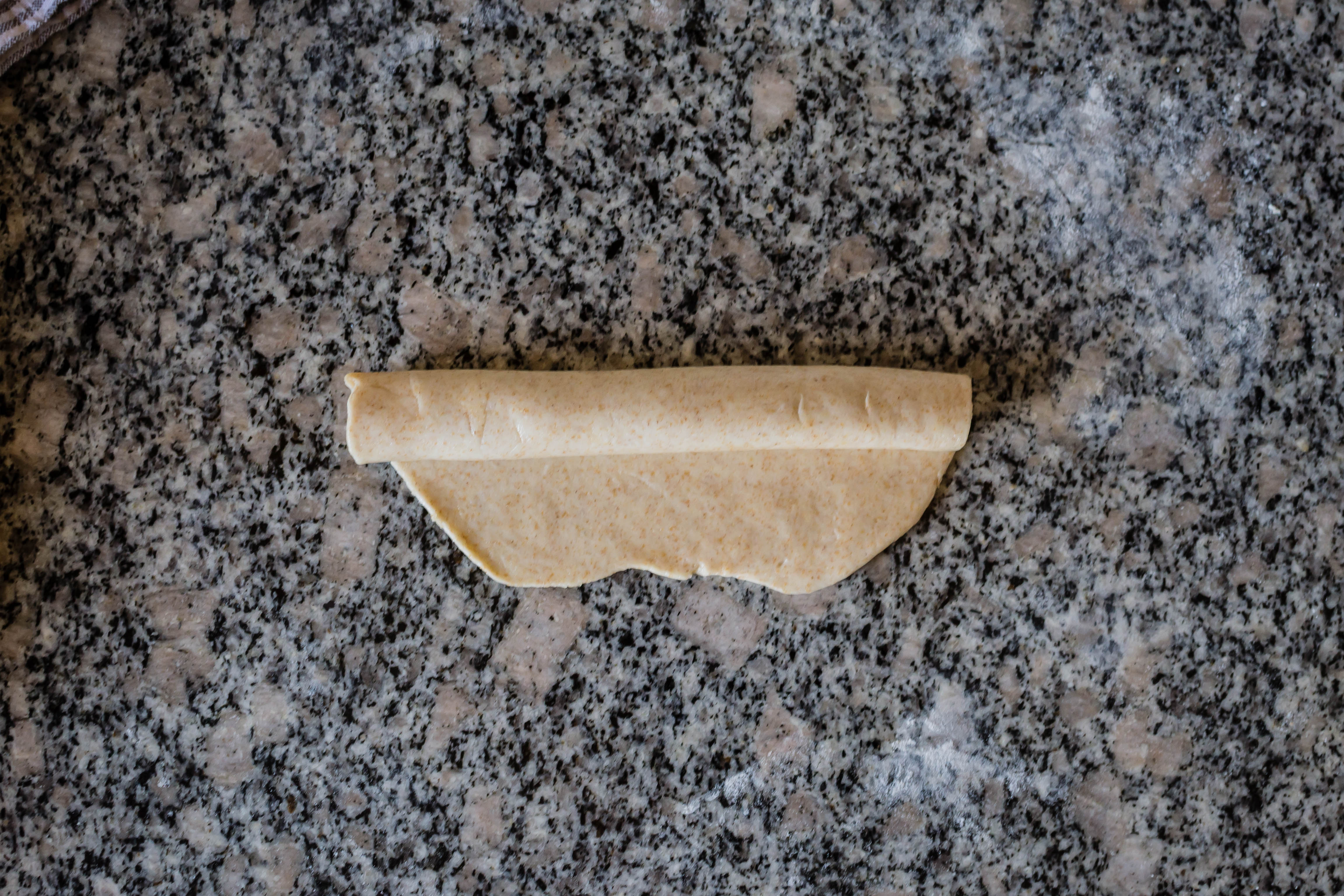 • For a round bread, lightly brush the surface of your thin circle with oil or ghee, then roll it up into a log as you would for cinnamon rolls (some recipes instead call for a series of pleats or folds). Then coil up this “log” you’ve created like a snail shell, tucking in and securing the exposed end.