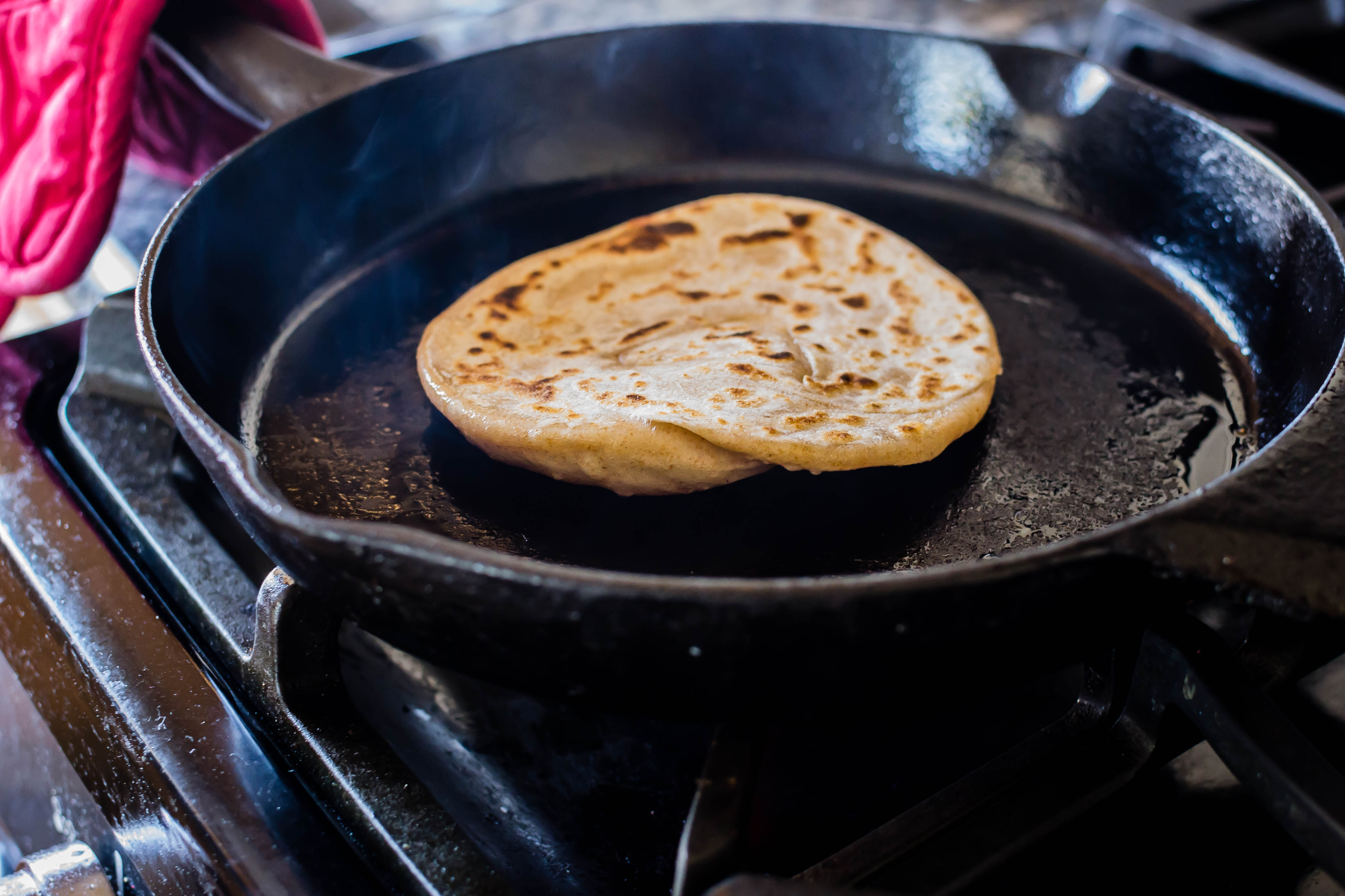 • To cook, heat about 2 teaspoons of oil or ghee in a skillet or griddle over medium heat. Again working one at a time, add each flattened circle or square of dough to the heated oil and cook about 2 minutes. Brush the uncooked side lightly with more oil or ghee and flip. Immediately press down on the browned side of the bread with a spatula – this helps all of the bottom surface area brown, but it also seems to help the flatbread puff up evenly. Cook another 2 minutes, until both sides are well browned and the flatbread is fully cooked inside – this took longer than I expected, which is why I’m calling for only medium heat.