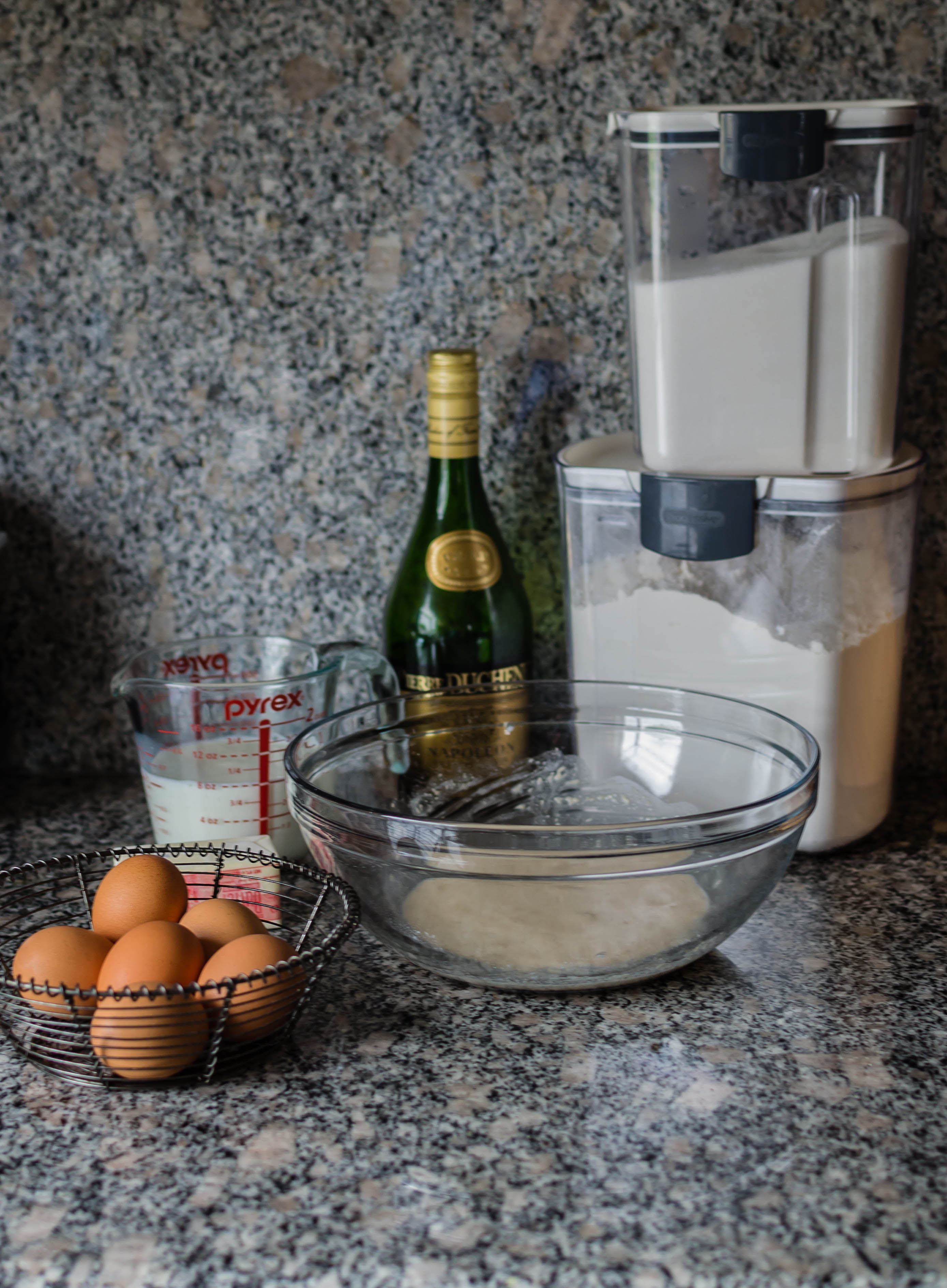 • Once the yeast is bubbly and smells like bread, add 2 cups of all-purpose flour and all of the milk; stir together with a rubber spatula or wooden spoon or knead by hand until well integrated, then cover and let rise 30 minutes.
