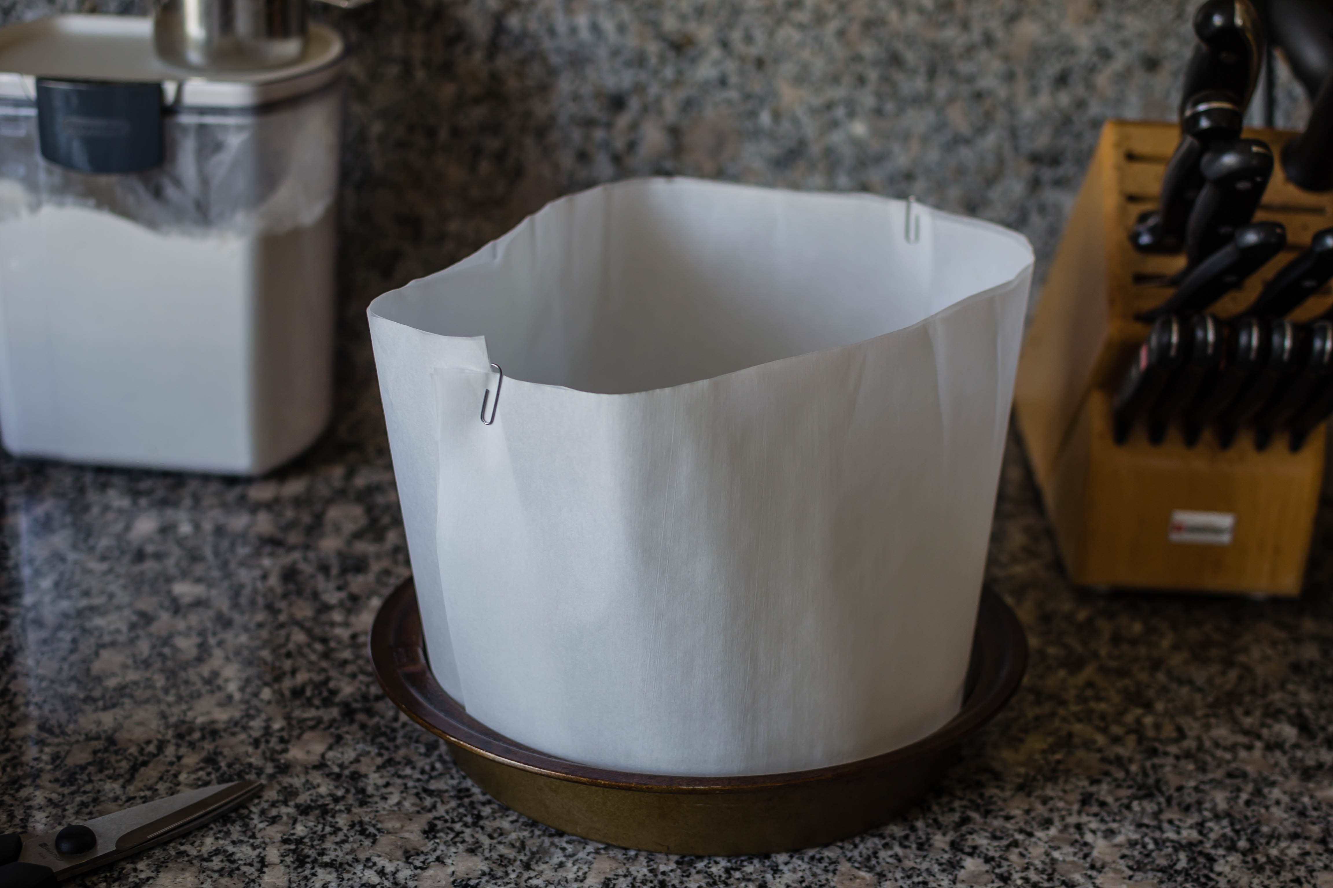 • While the dough is rising, prepare the baking pan: butter or grease a 9-inch round baking pan – it’s best if this has high sides but low sides work too. Cut a piece of parchment paper long enough to make a full circle around the inside of the pan. Fold it in half so you have a double layer, then wrap it around the inside of the pan to make a kind of collar – this will ensure the loaf rises straight up instead of bulging out as it bakes. You can use a paperclip at the top to hold the edges of the collar together.