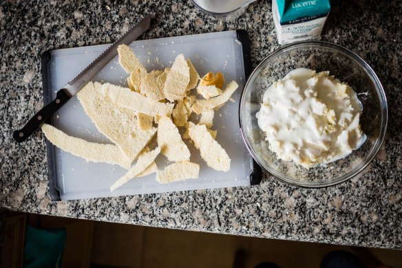 - When the espresso mixture has cooled, you are ready to assemble. First, soak the chopped or crumbled chocolate wafers in the espresso liquid for a few seconds. You want the liquid to permeate but you don’t want the cookie to sog into nothing. In cocktail glasses or dessert goblets, carefully add a layer of soaked cookie pieces. Top that with a layer of the cooled custard – it will still be fairly thin – then repeat: another layer of cookies, another layer of custard. You want at least two layers of each.