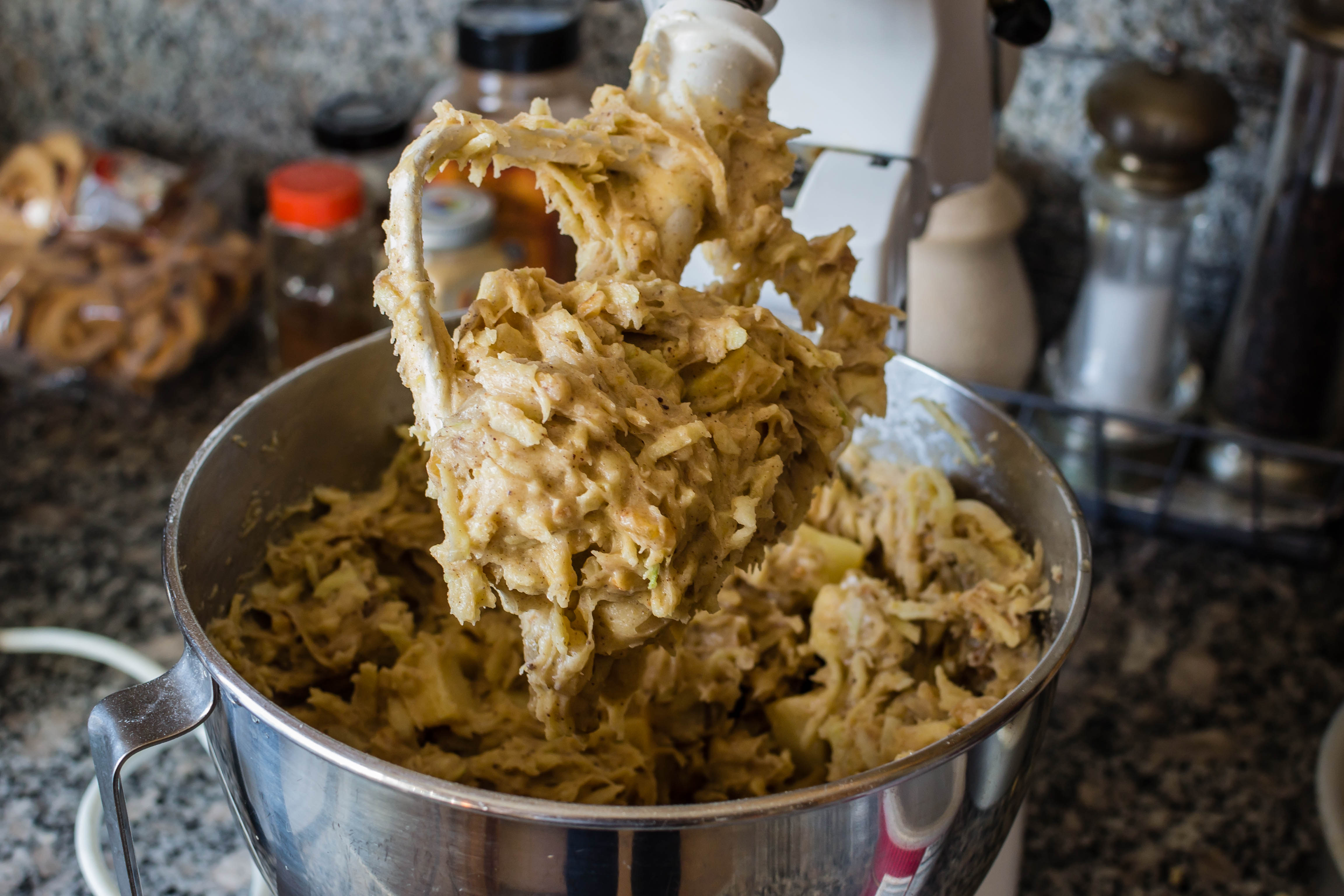 • Scoop out about 1 cup of the frosting and add it to the small bowl with the walnuts and dried apples; use a flexible spatula to mix in. This is your filling.