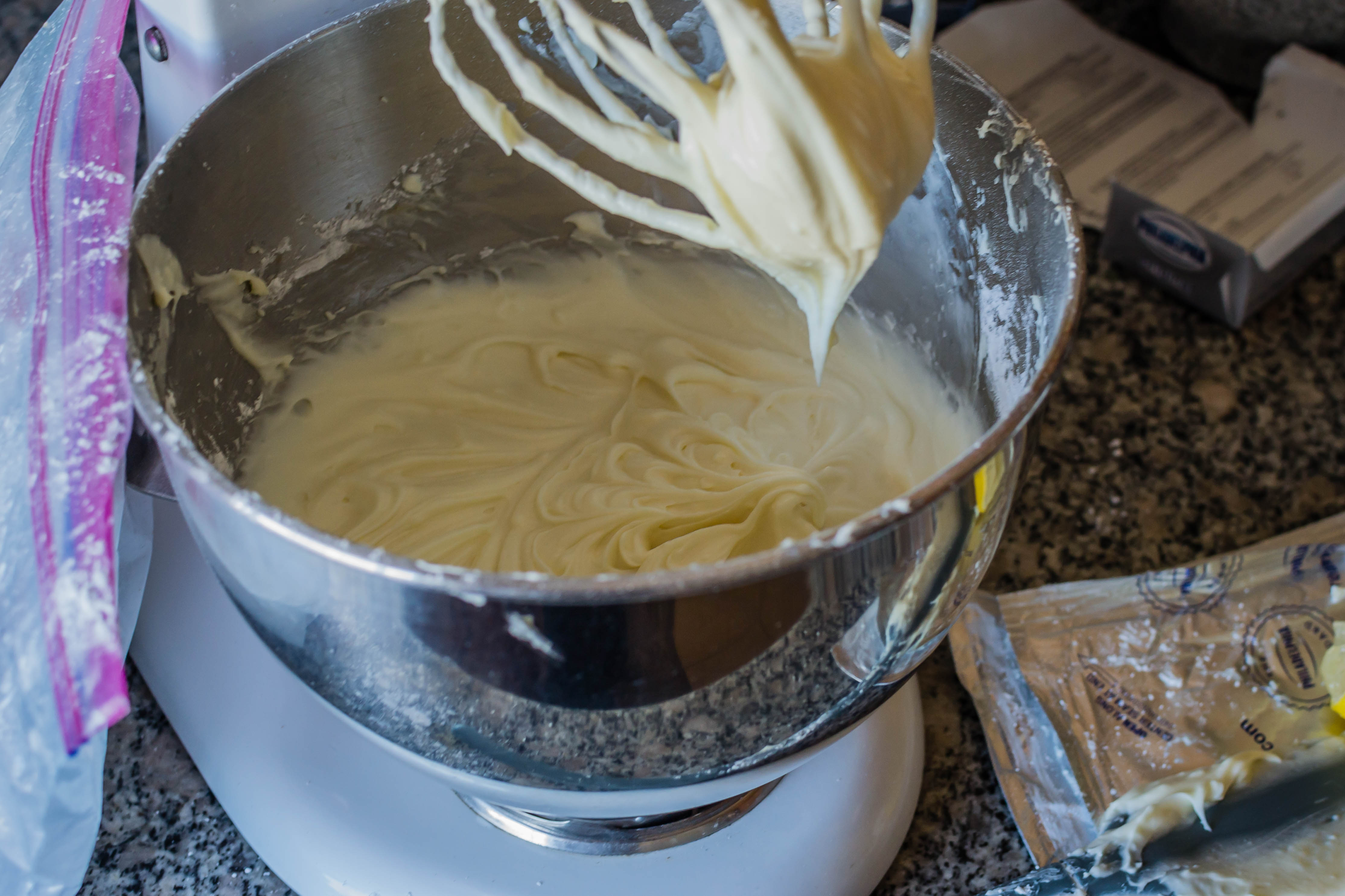 • In a large bowl, beat together the room temperature butter, cream cheese, vanilla, and lemon juice until well combined. Scrape down the sides of the bowl and the beaters to ensure full integration.