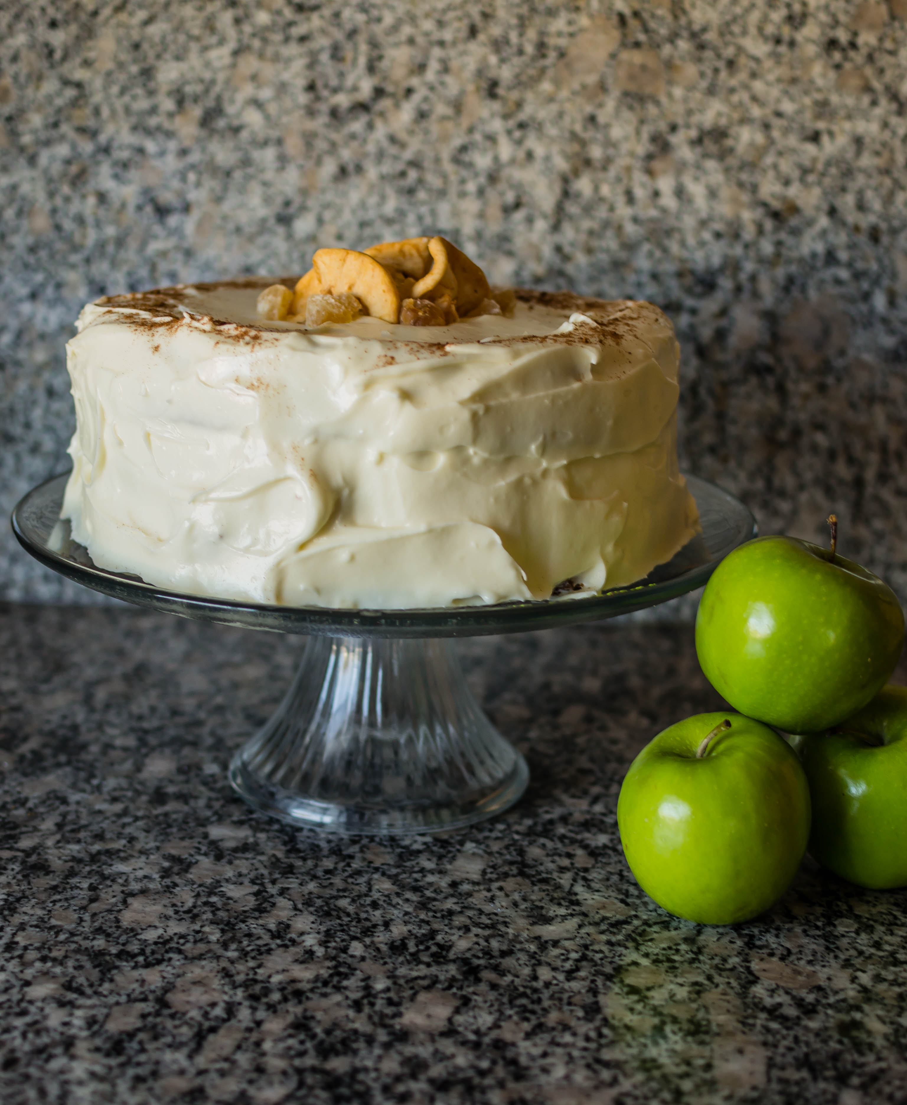 • This looks lovely with just the frosting, but if you want to decorate a little, consider artfully arranging a few dried apple rings and chunks of crystalized ginger in the center of the cake, then dusting the top edge with cinnamon before slicing and serving.