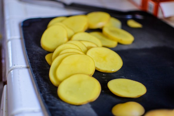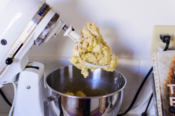 This is not one of those “not your average gloopy potato salad” iterations. I must admit, as an ardent mayonnaise lover, I resent those complaints about gloopiness. This one is gloopy. It is unapologetically gloopy. It is a potato salad for mayonnaise aficionados. But I have an important secret when it comes to those “gloopy” mayonnaise based summer salads, whether their bases are potato or pasta: you have to add the dressing while the starch base is still warm. If the potato chunks or noodles are cold, the dressing just weakly sits beneath and around them. If it’s stirred in while they are warm – or even hot – the dressing soaks in. The texture is better, the flavor is better, and you can get the hot part of the process out of the way hours before you intend to serve anything. At least 2 hours in the fridge after everything is combined ensures nicely melded flavors – the anchovy mellows, the garlic relaxes, the lettuce emerges not as a strong presence but as a juicy green background taste we found quite pleasant.