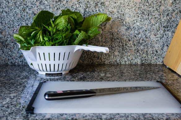 This is a recipe born out of need and change and a series of odd connections. I bought a bag of red potatoes intending to make a gratin, but a sudden upswing in temperature made the idea of roasted anything feel oppressive. Meanwhile, my beautiful heads of romaine lettuce in my garden started to bolt, and my parsley was already flowering. I thought of salad, of course, and then of potato salad, and then of likely ways I could combine them. A potato salad with green beans and parmesan I had in Eugene crept back into my mind, and parmesan reminded me of pesto. Pesto is such a convenient way of using excess greens, even when they are getting bitter, so I wondered if lettuce pesto would be tasty. The garlic and parmesan of pesto along with the lettuce reminded me of Caesar salad, and suddenly I was adding anchovies and mayonnaise and hard-boiled eggs for good measure, and this franken-potato-salad was born.*