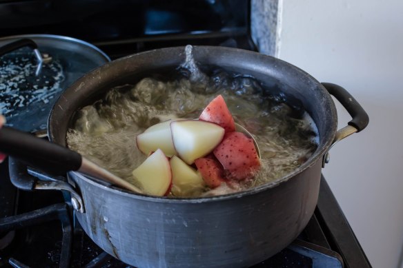 - Blanch the green beans in a large pot of boiling salted water. This will take 2-3 minutes for large size beans, or about 90 seconds for skinny little haricot verts. Remove from the pot and douse in cold water to stop them from cooking further. Reserve the salted cooking water. Quarter the potatoes (or if they are gigantic, cut down into large bite-sized pieces) and place them in the same pot. Fill the pot with more water if needed to cover the potatoes, then bring back to a boil over high heat. Turn down to medium and simmer until the potatoes are just tender when pierced with a fork. Drain and set aside while you make the dressing.