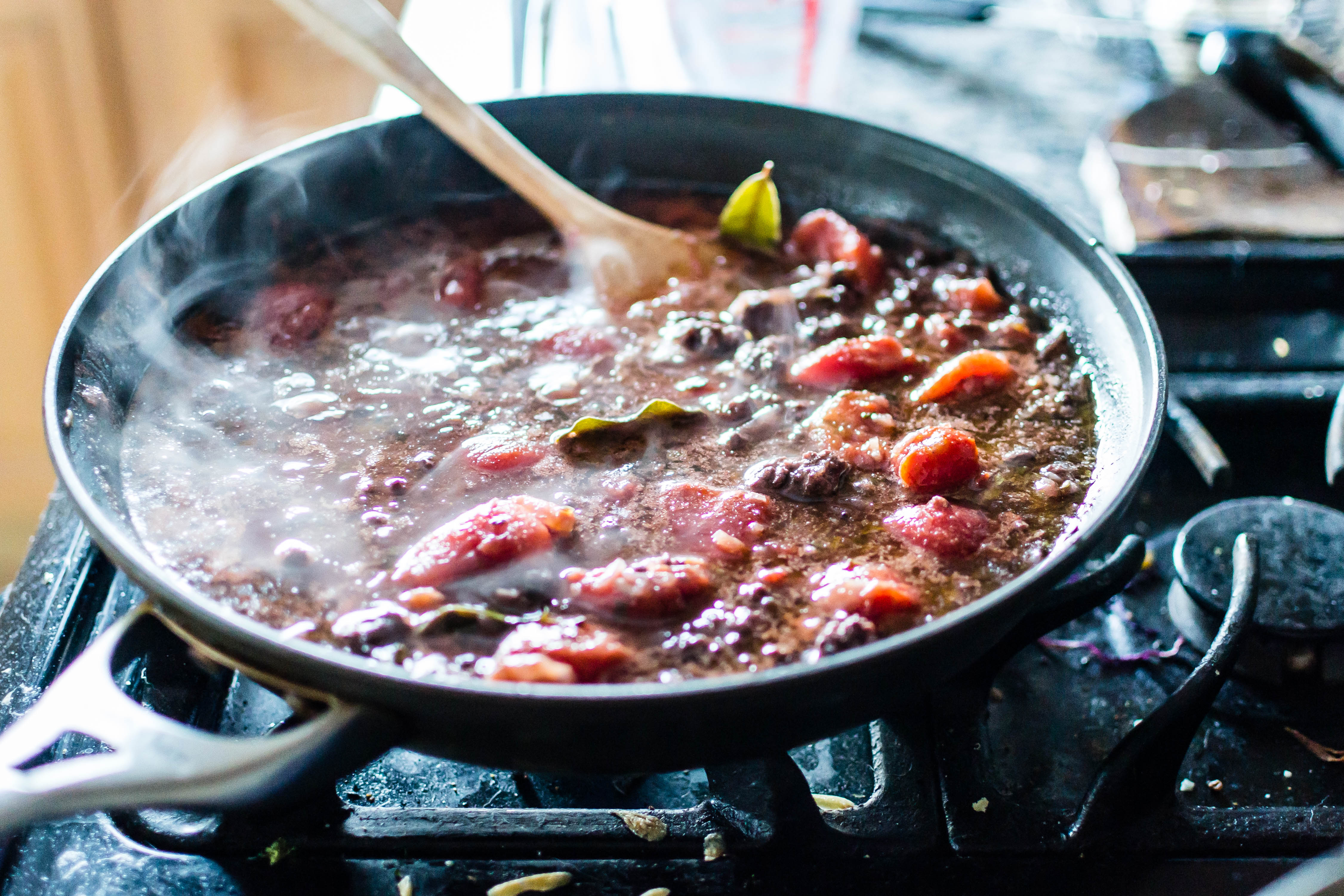 - Dump in the canned tomatoes and their juice, stir, and turn the heat down to medium-low. Simmer for 20-30 minutes, stirring occasionally. Periodically, crush the tomatoes with the back of a wooden spoon or with a potato masher (be careful: they squirt!).