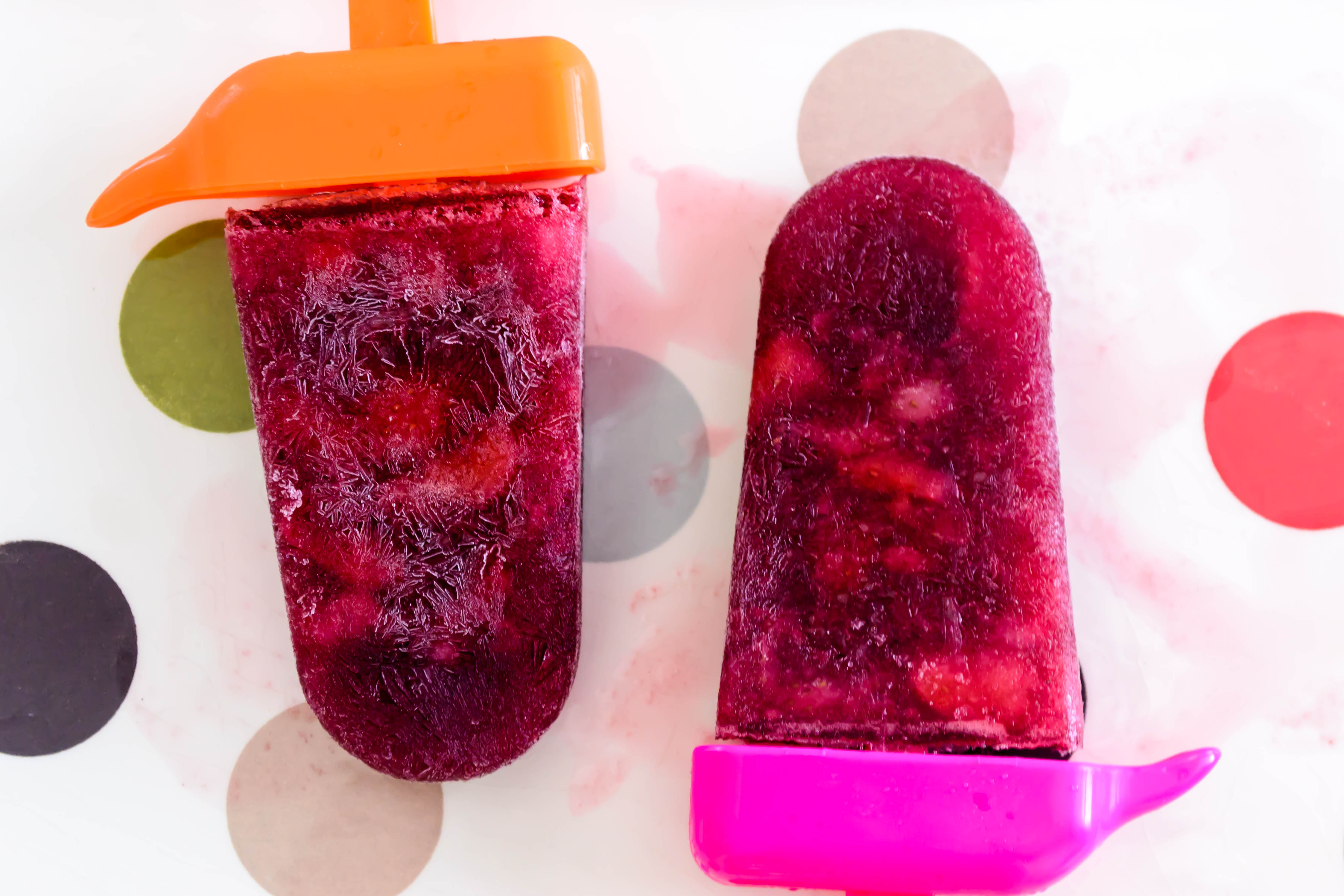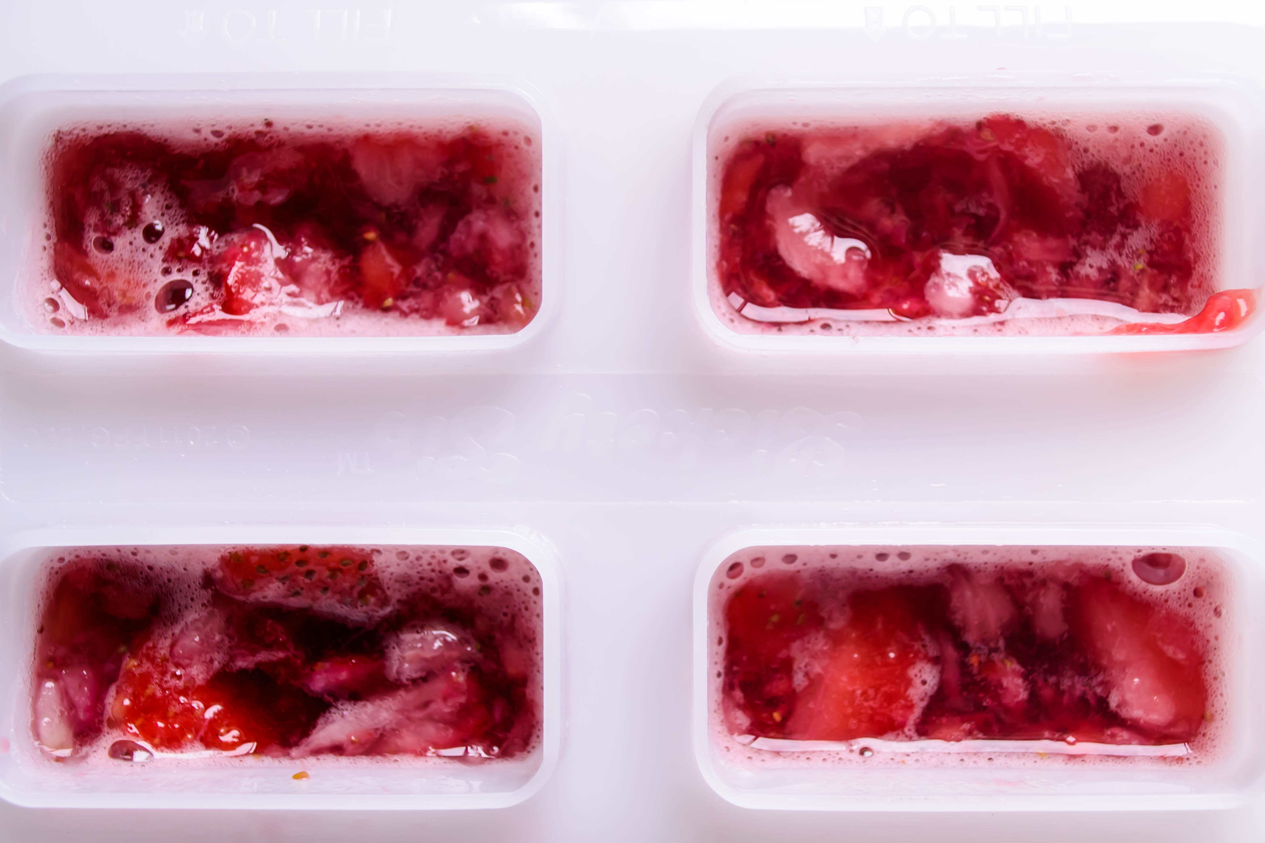 - If you want to make popsicles, spoon the liquid into popsicle molds until almost full (we want to account for expansion), being sure to get plenty of strawberry bits in each one. Add sticks or holders and freeze overnight or until solid. To unmold, dip each compartment into warm water for a few seconds, then carefully and gently pull the popsicle out. Don’t rush them or they may break. Just give them a few seconds to separate from the plastic.