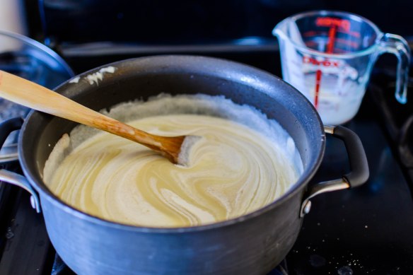 This is not one of those “not your average gloopy potato salad” iterations. I must admit, as an ardent mayonnaise lover, I resent those complaints about gloopiness. This one is gloopy. It is unapologetically gloopy. It is a potato salad for mayonnaise aficionados. But I have an important secret when it comes to those “gloopy” mayonnaise based summer salads, whether their bases are potato or pasta: you have to add the dressing while the starch base is still warm. If the potato chunks or noodles are cold, the dressing just weakly sits beneath and around them. If it’s stirred in while they are warm – or even hot – the dressing soaks in. The texture is better, the flavor is better, and you can get the hot part of the process out of the way hours before you intend to serve anything. At least 2 hours in the fridge after everything is combined ensures nicely melded flavors – the anchovy mellows, the garlic relaxes, the lettuce emerges not as a strong presence but as a juicy green background taste we found quite pleasant.