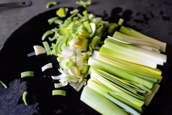 3 leeks, white and pale green parts only, split vertically, cleaned under running water, and sliced thinly into half moons