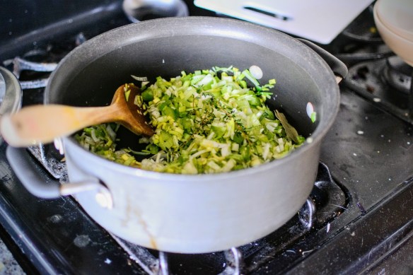 - In a large pot, heat the olive oil over medium low. Add the prepared leeks, celery and fennel, along with the herbs de provence, thyme, bay leaves, and a sprinkle of salt. Sweat until the leeks have softened but not browned, about 8-10 minutes. Add the garlic and anchovies and cook, stirring, for 1-2 minutes until the garlic is fragrant and the anchovy fillets have broken up.