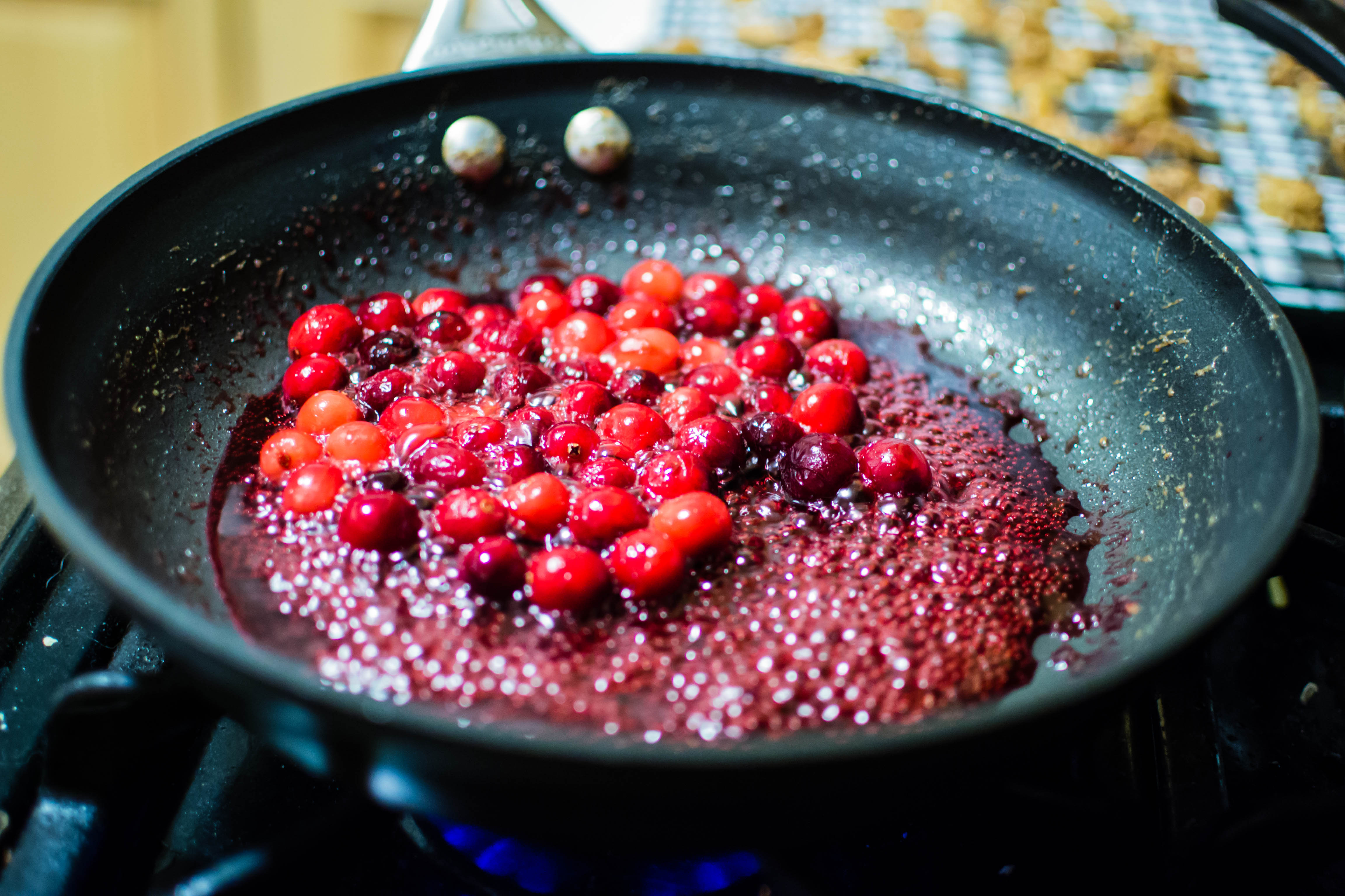 • To make the dressing, heat the cranberries, the 2 tablespoons honey or maple syrup, and the tablespoon of water in a skillet over medium-high heat. Swirl or stir occasionally until the cranberries pop, 5-6 minutes.