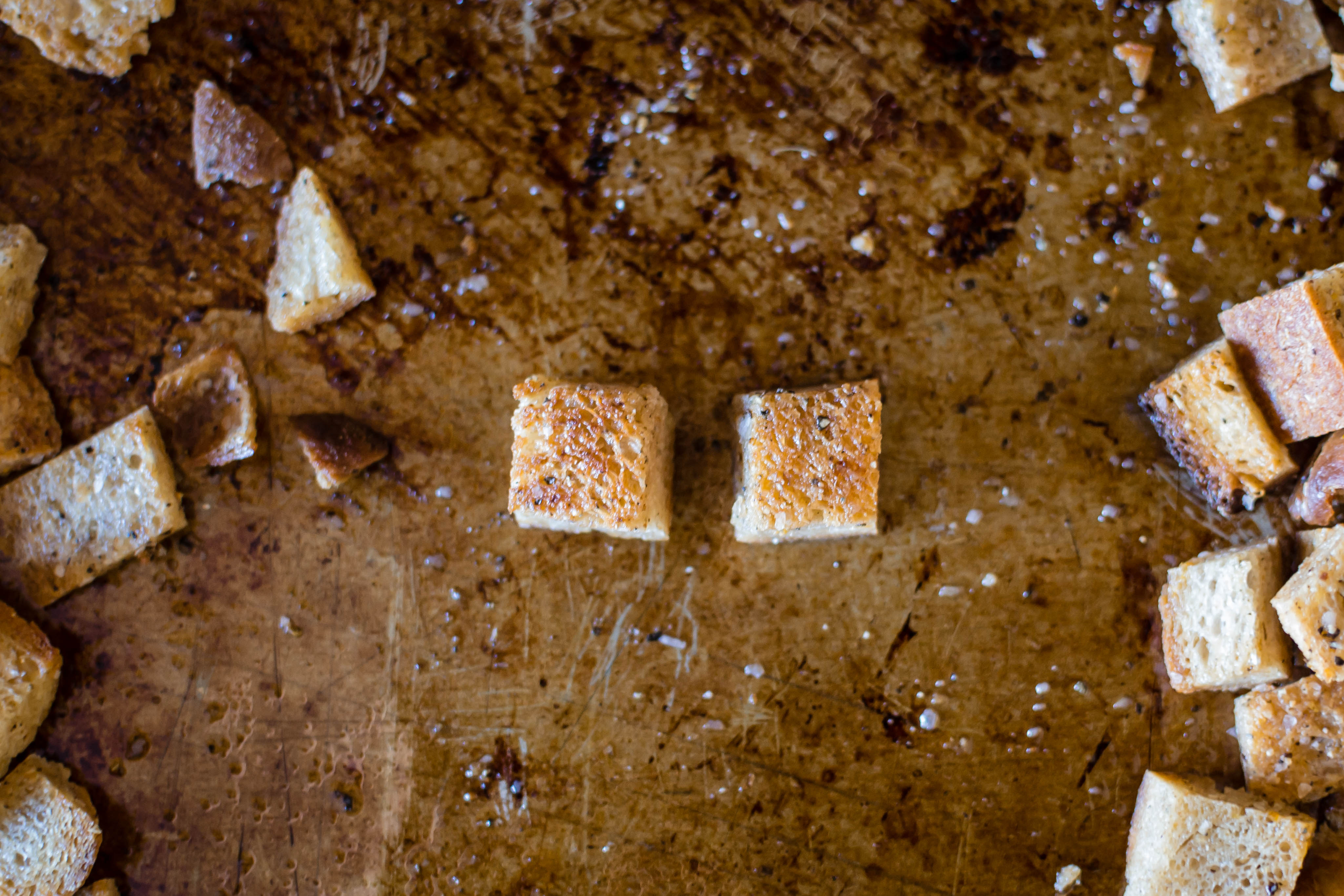 • To bake, spread seasoned cubes on a cookie sheet and stow in the oven for 15-25 minutes, depending on how crunchy you want your end product. 15 minutes preserves some give in the middle; 20-25 minutes results in fully crunchy cubes.