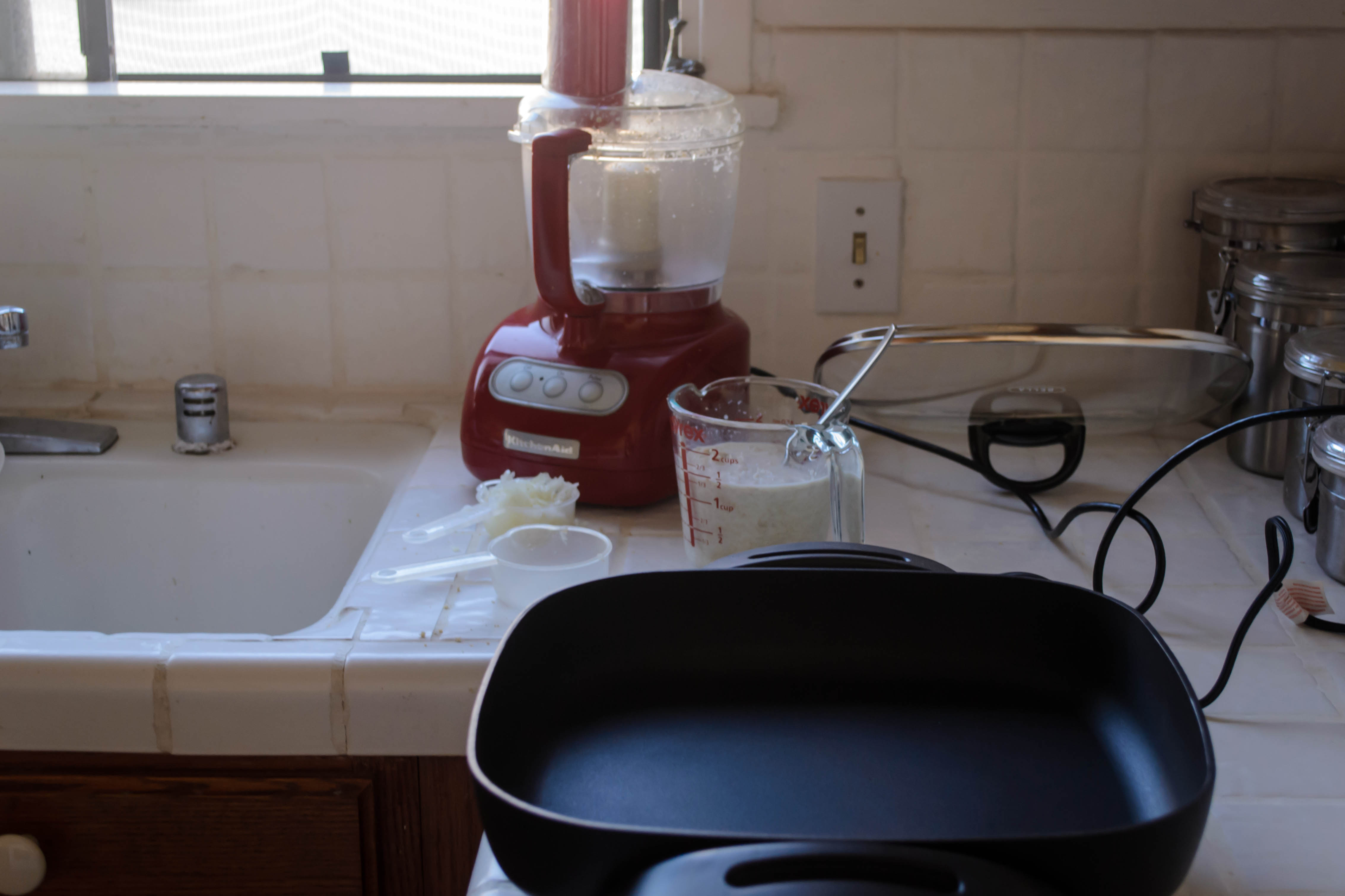 In my version, because I also wanted to minimize the number of dishes I was going to make N. wash (our version of an egalitarian kitchen: whoever cooks, the other one has to wash up. You can guess how this usually works out), I decided to go for the food processor instead of the stand mixer. I was going to use it to make fresh breadcrumbs anyway, and decided relying on it to grate my onions and mix up the meat would keep things easy. In retrospect, this seems counter-intuitive – wouldn’t the blade tear apart the meat proteins, rather than elongating them? Yet it did produce a pleasing texture.