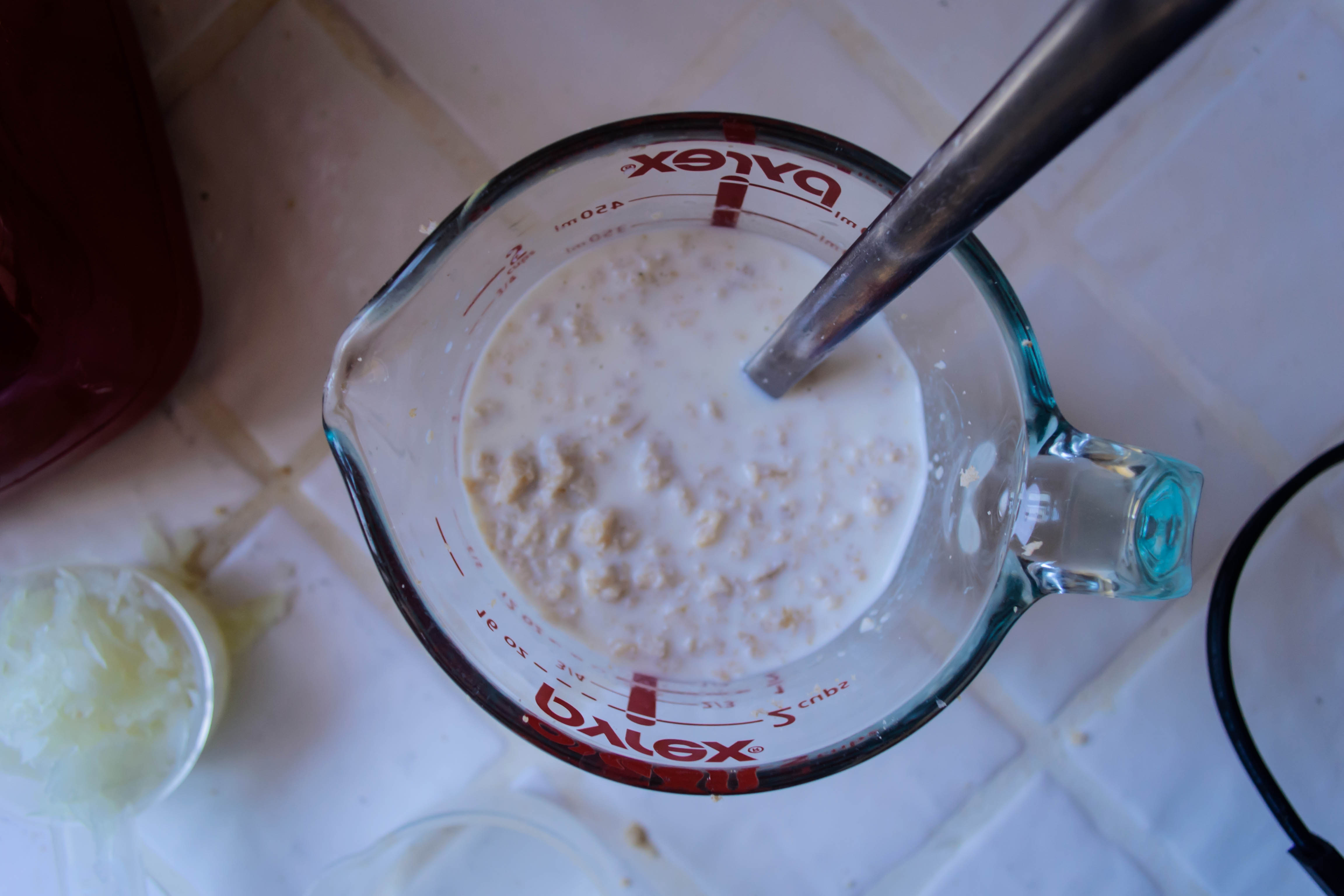 - While onion cooks and cools, use the regular blade of a food processor to create 1½ cups bread crumbs from 1-2 slices of bread (stale is fine). Combine the bread crumbs, the milk or half and half, and 1 teaspoon of dijon mustard in a small bowl and let soak for 5 minutes.