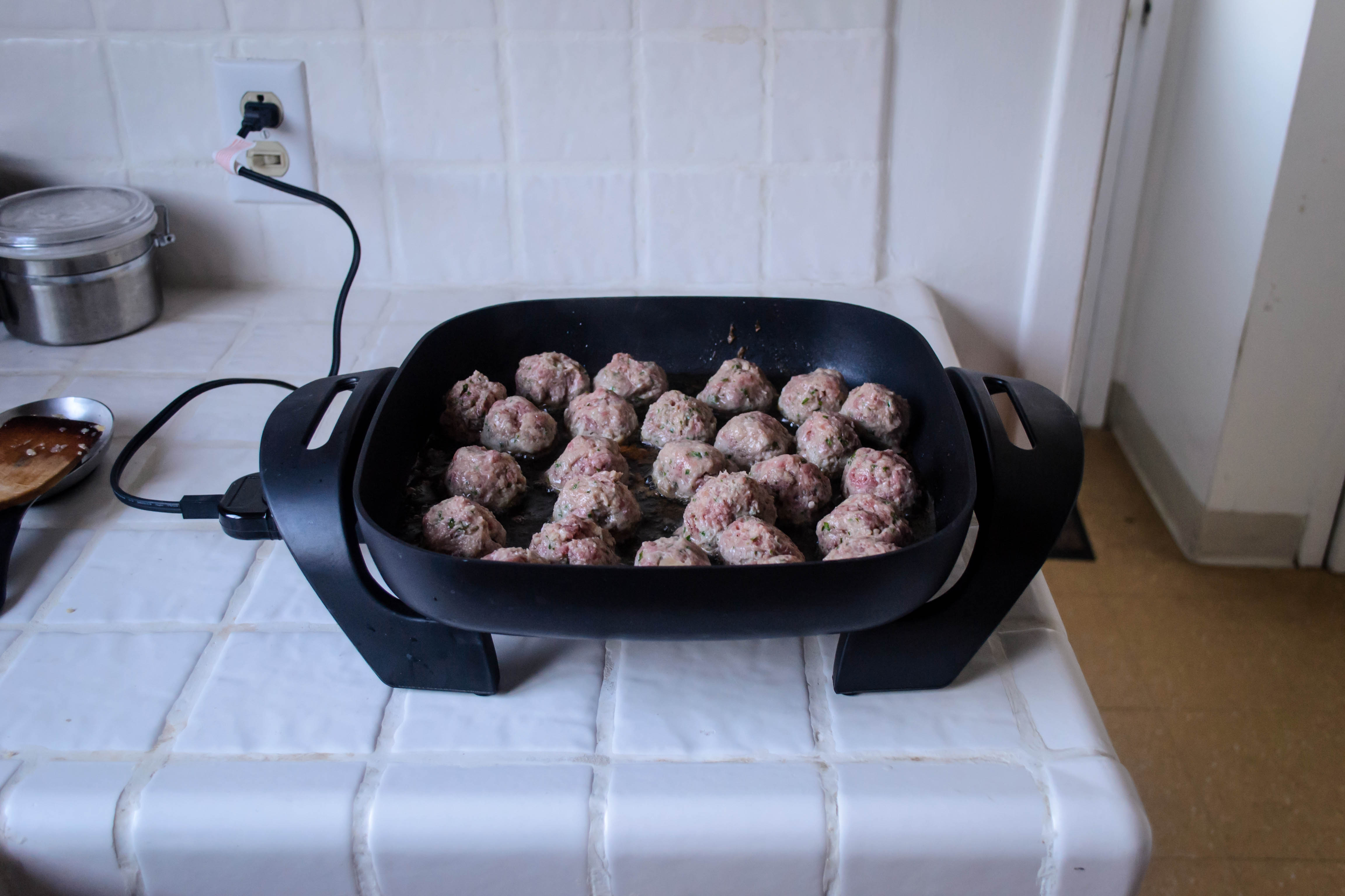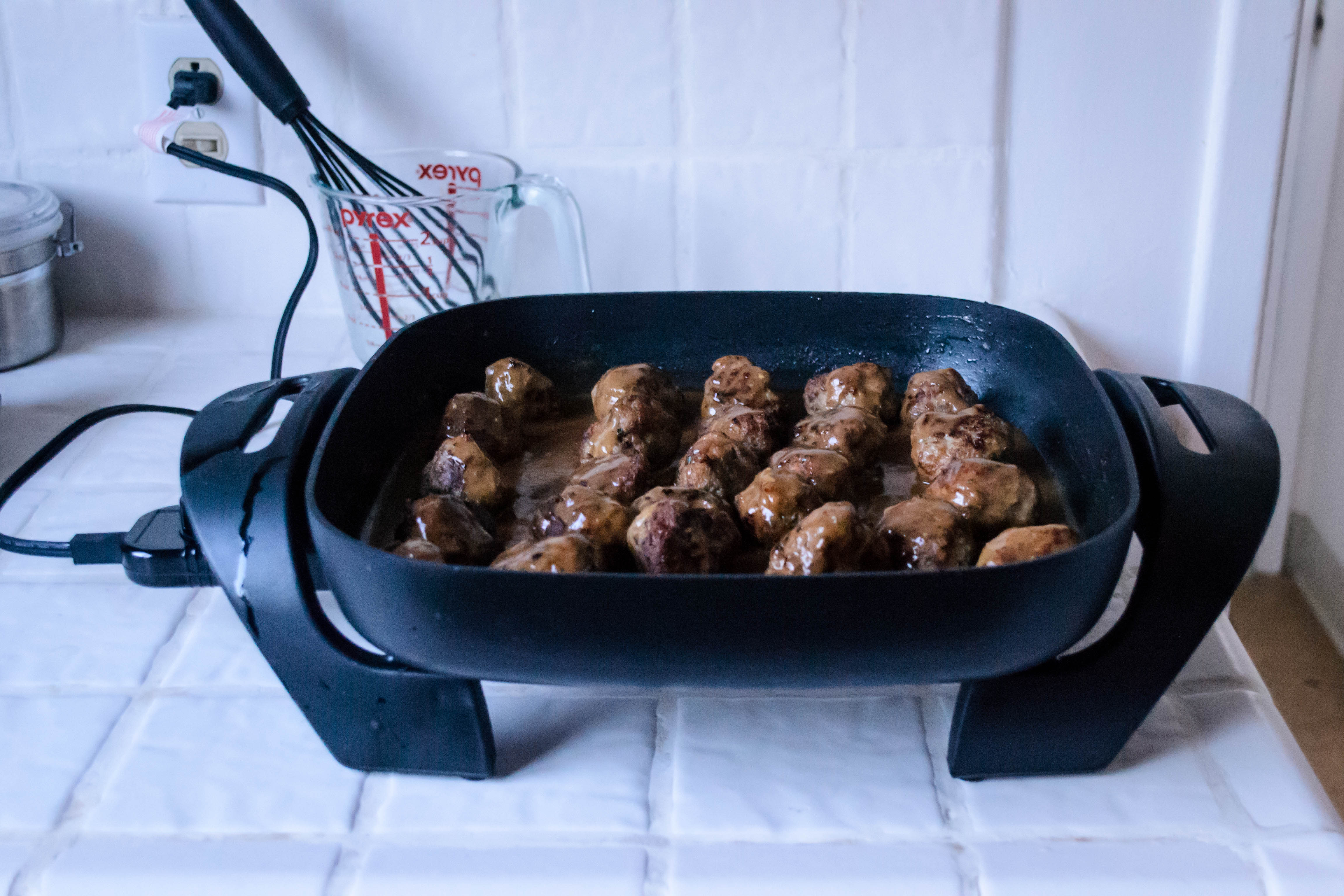 Mom (and Myrna) brown their meatballs in a few tablespoons of butter, then finish them by simmering them in the gravy for half an hour. The CI version, on the other hand, does more of a shallow fry in vegetable oil, cooking the meatballs completely and then just running them through a quick turn in the sauce. I decided, again, on a slight compromise. I used less oil than the CI recipe, and browned the meatballs on all sides, opting to use my electric skillet so I could control the oil temperature. Once the meatballs were golden and felt almost crisp, I drained them, whisked up the sauce in the same skillet, and returned them to the gravy for the requisite half hour simmer. Any opportunity to add flavor seemed like the right thing to do.