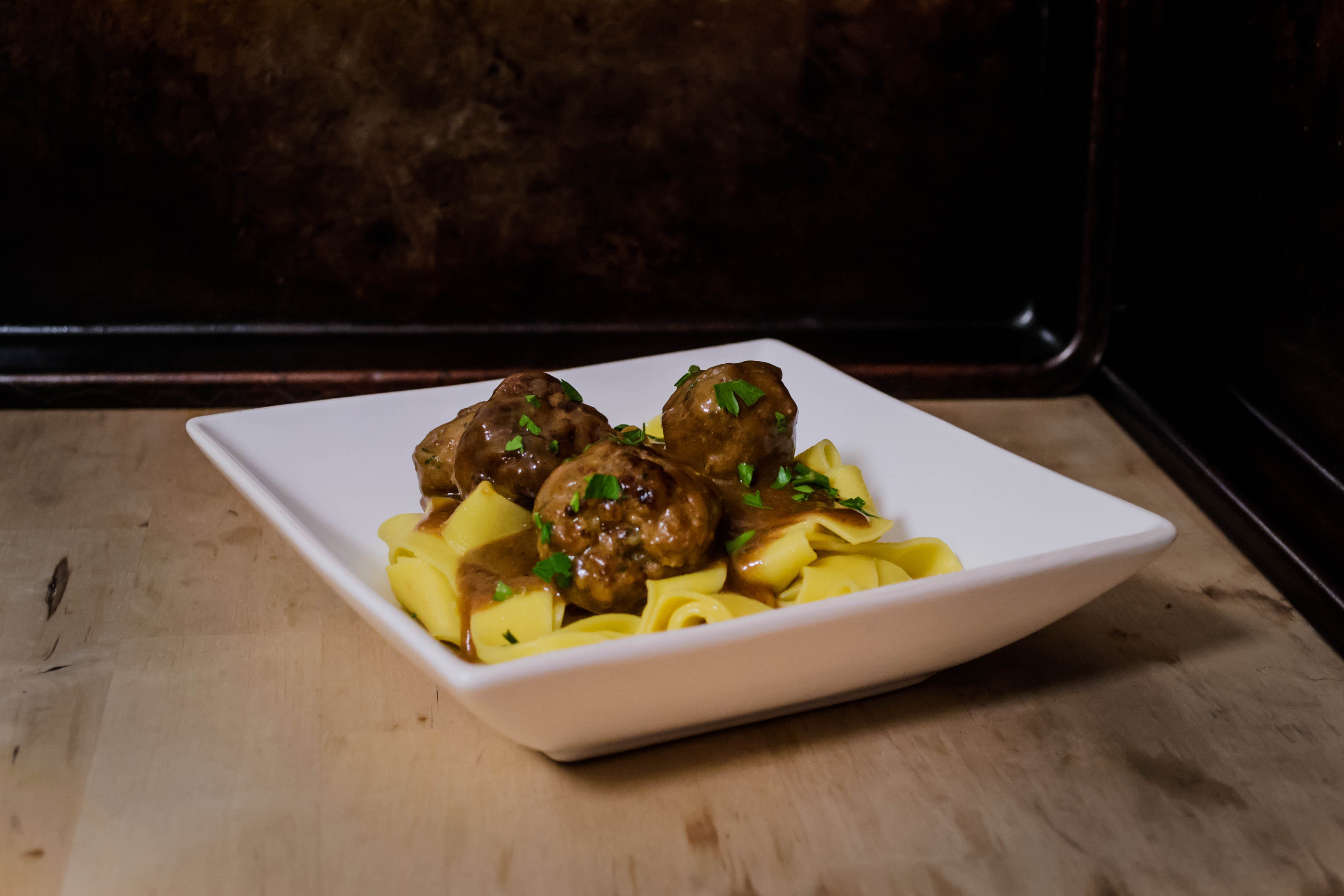- Serve hot or warm over buttered egg noodles, mashed or boiled potatoes, or with toothpicks for an appetizer or smorgasbord spread. Sprinkle the final tablespoon of parsley over the starch or the meatballs themselves for a little brightness.