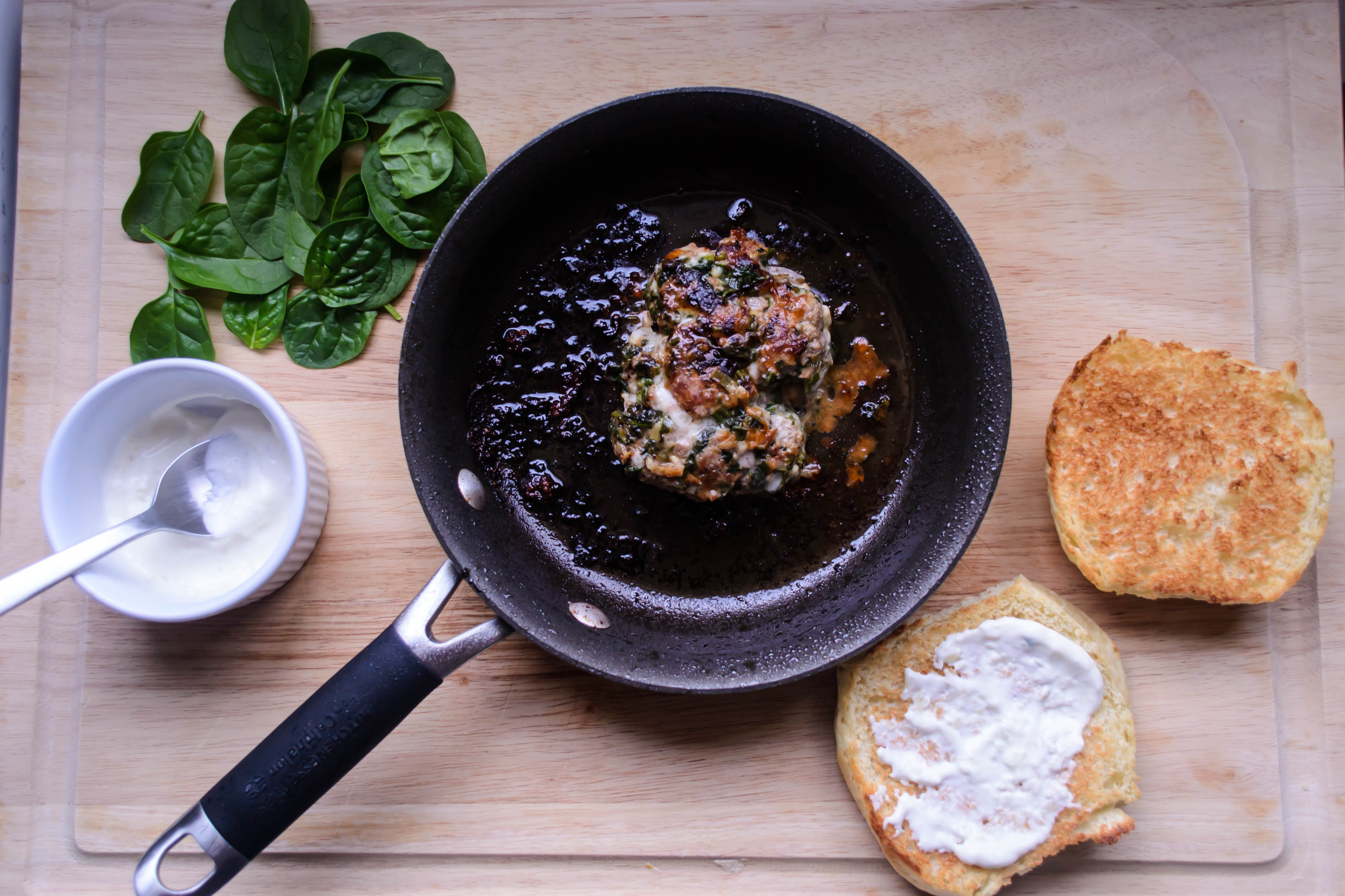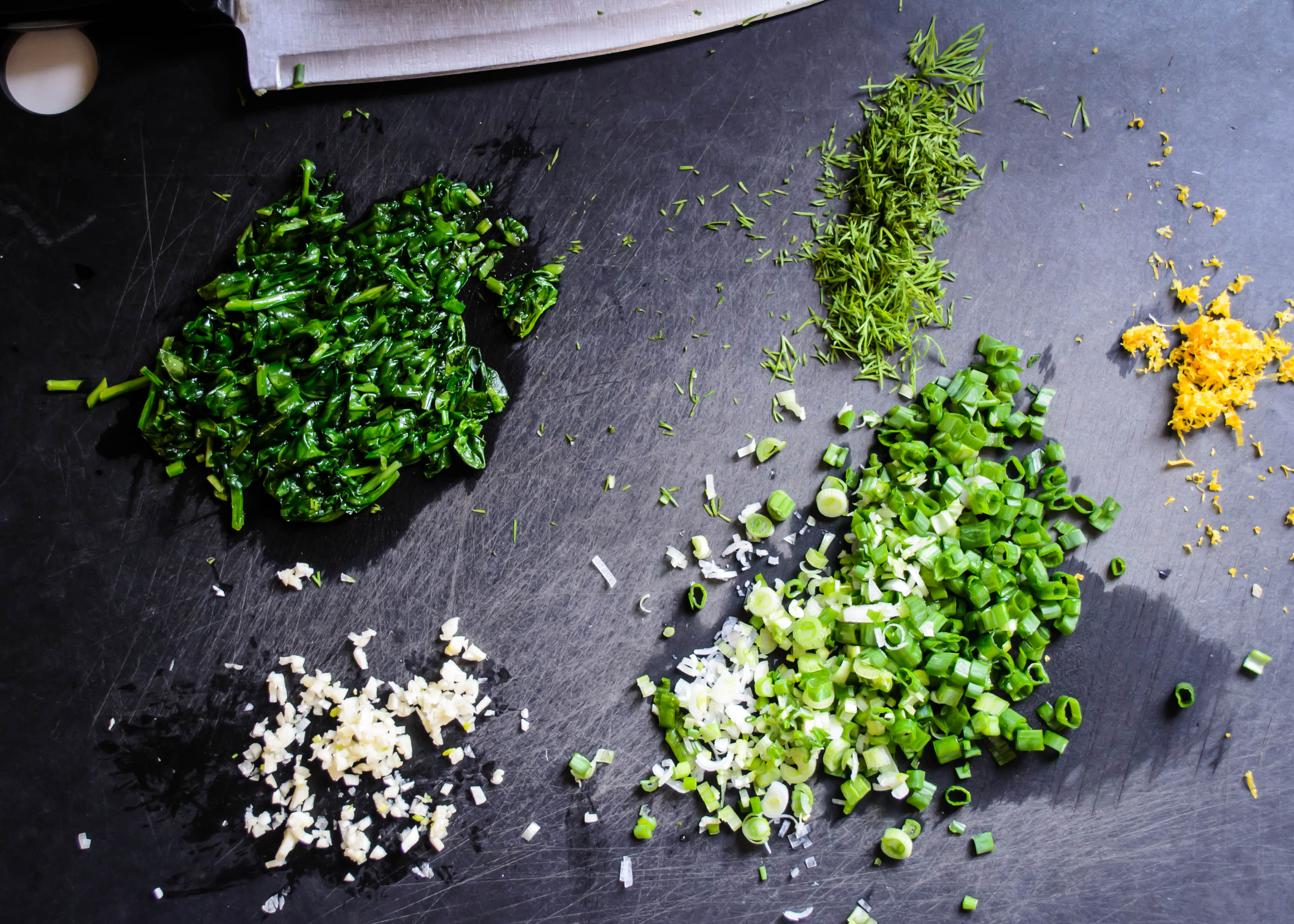 1 cup each baby spinach and baby arugula leaves, or 2 cups baby spinach (Ottolenghi gives his quantities in grams, and I admit I should have weighed mine, but the food scale is packed, so I estimated)